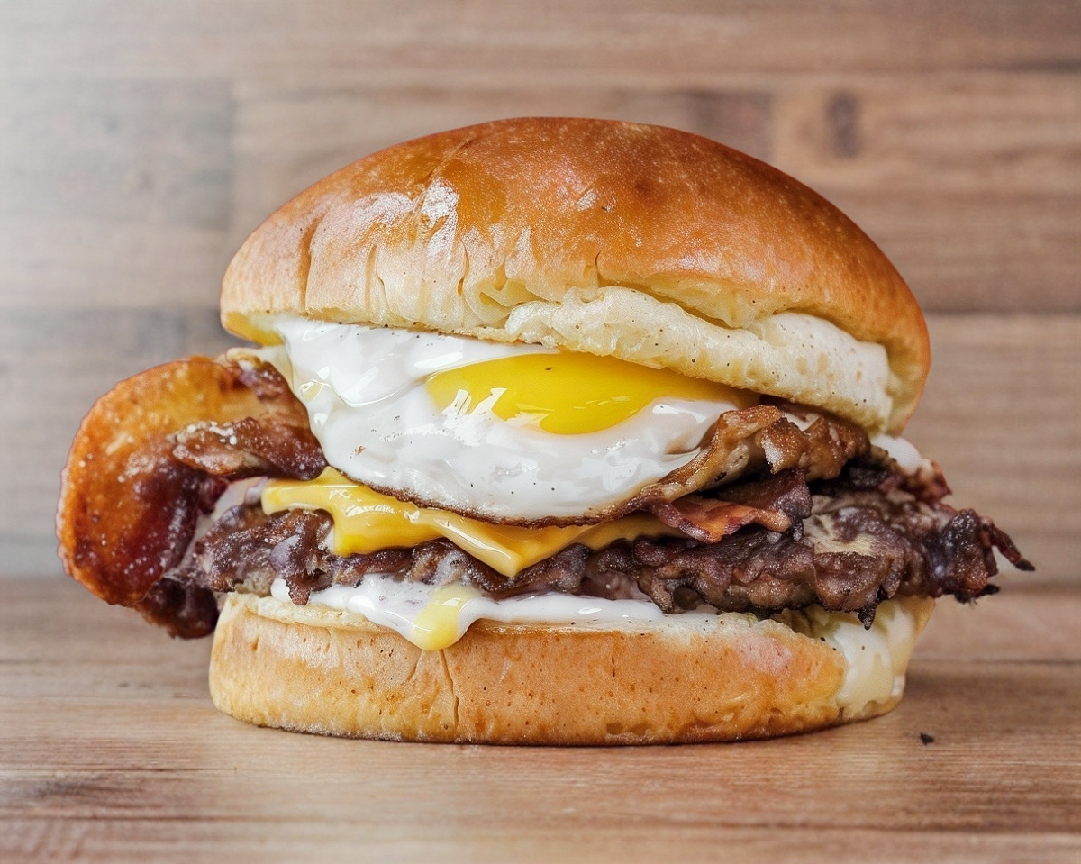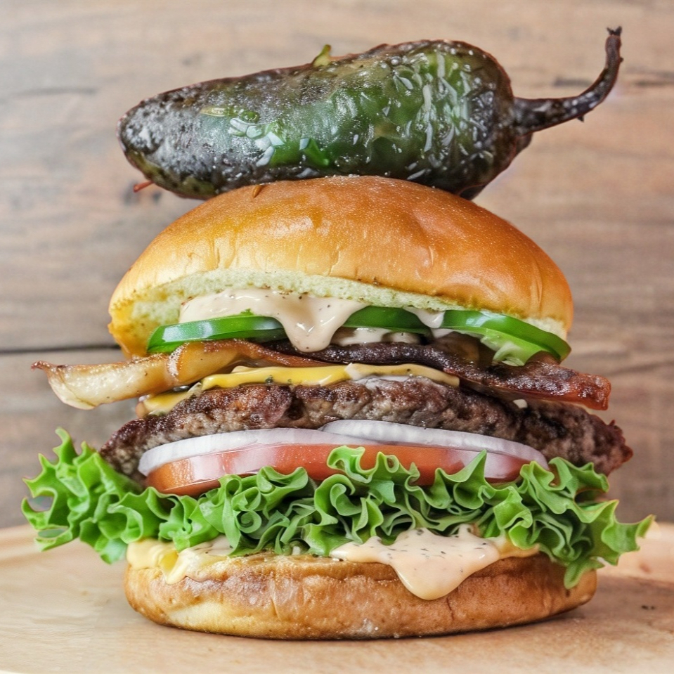 Carne de res, queso americano, huevo estrellado, aderezos, jalapeño salteado..