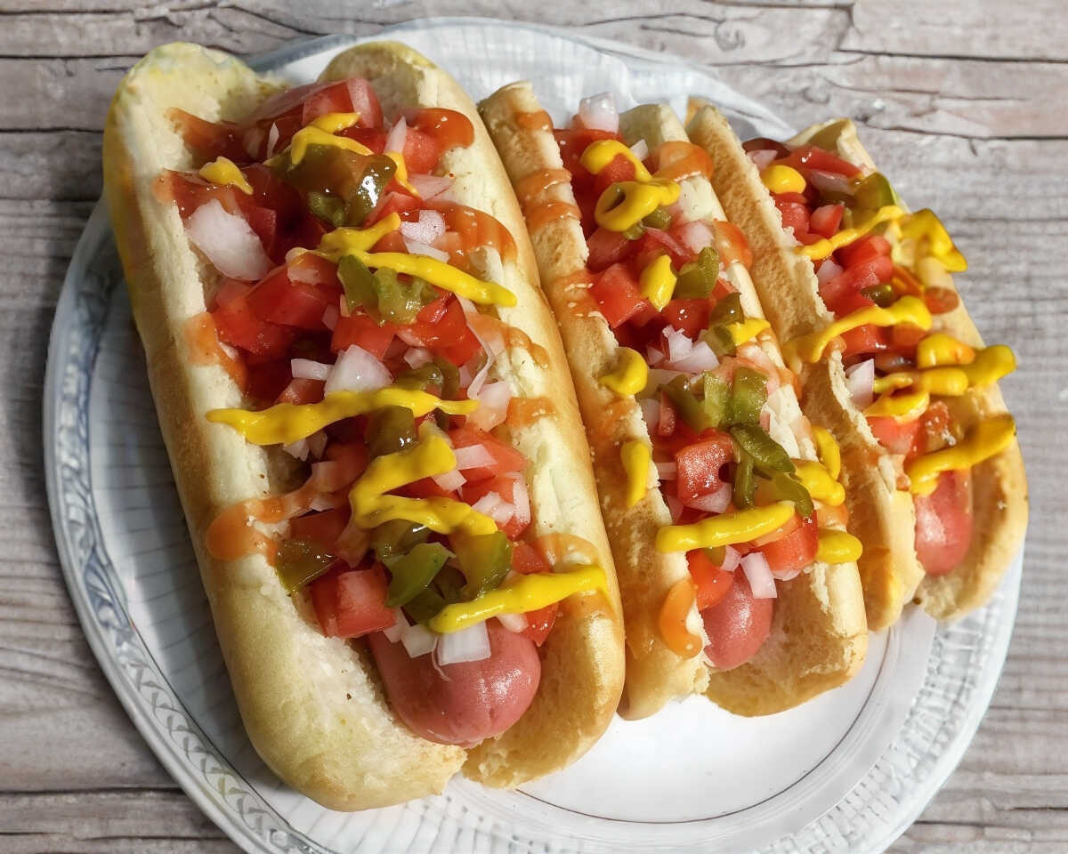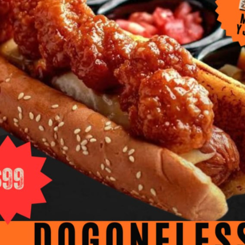 Hotdog de salchicha frankfurt, chorizo, queso hebra, aderezos, cebolla, y vegetales