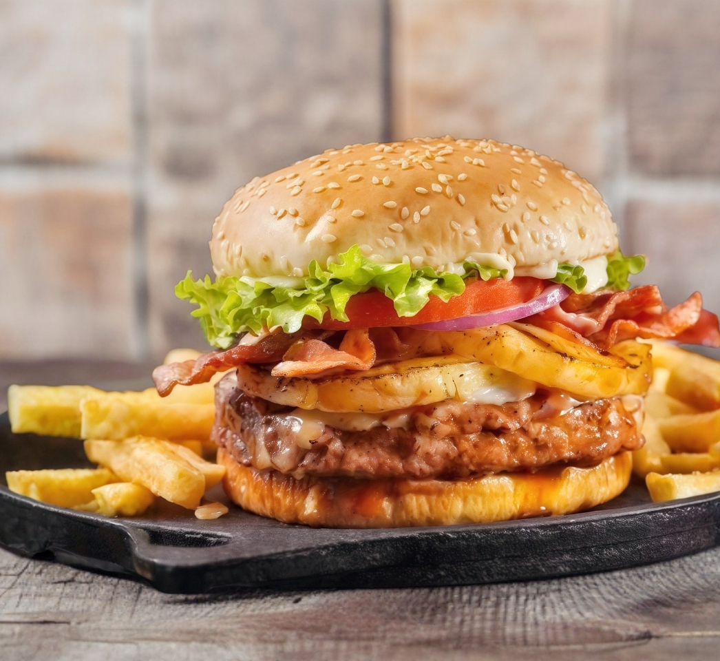 Carne de res, piña, tocino, BBQ, queso de hebra, aderezos, vegetales.