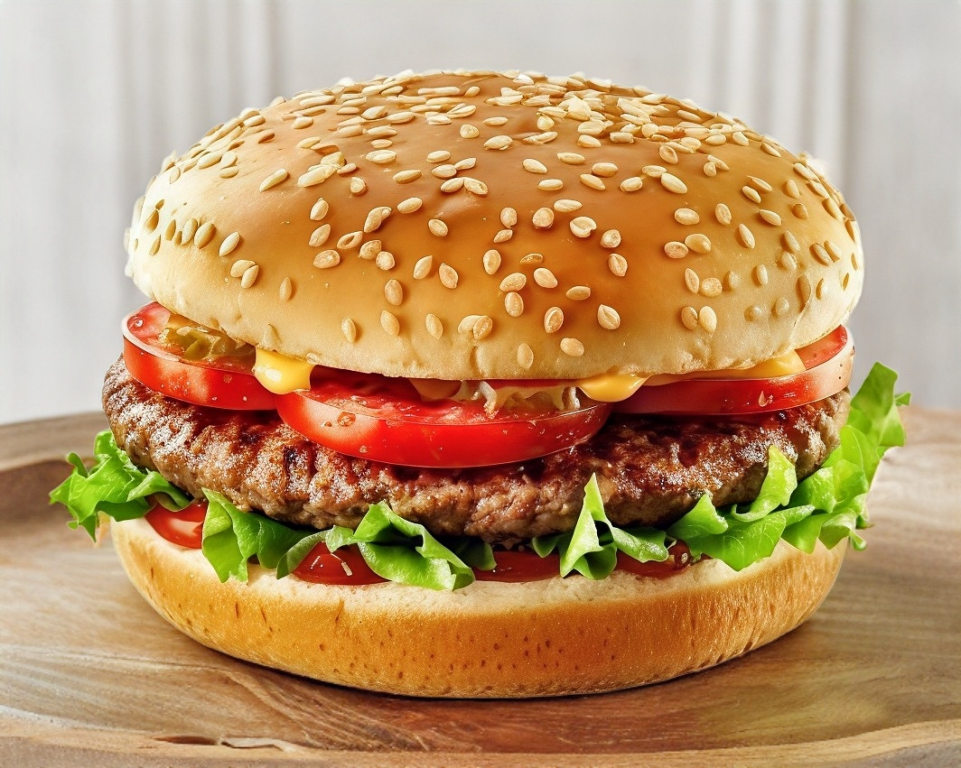 Pan infantil, carne, queso americano. Vegetales, aderesos