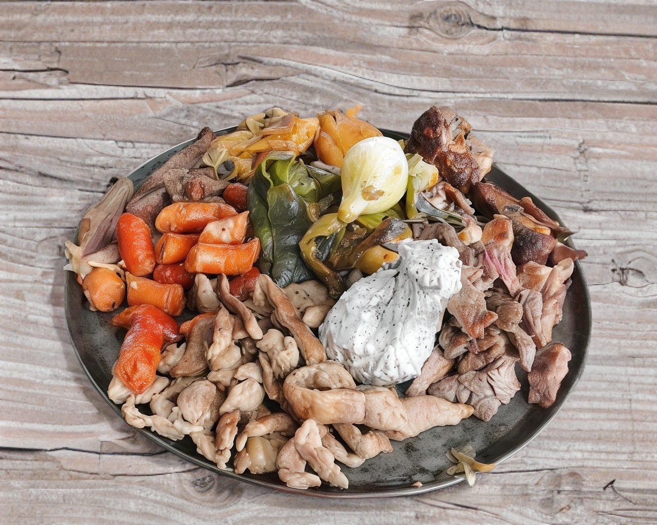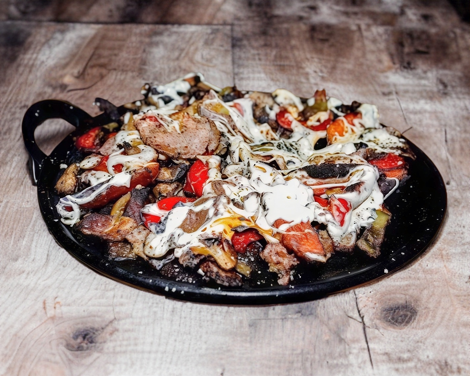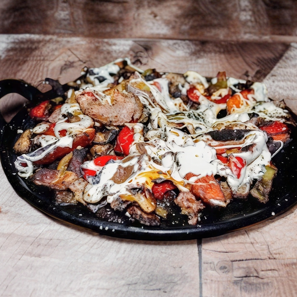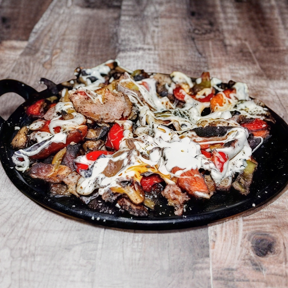 Único y especial, cocinado con pimentos, nopal y cebolla asados, carne asada, arrachera, salchicha asada y chistorra. Gratinado con queso de hebra.