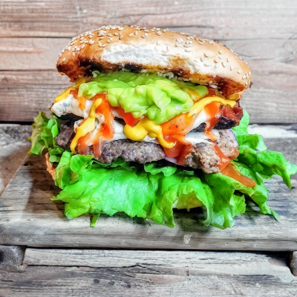 Exquisita hamburguesa con triple carne 100% res casera y jugosa al carbón
