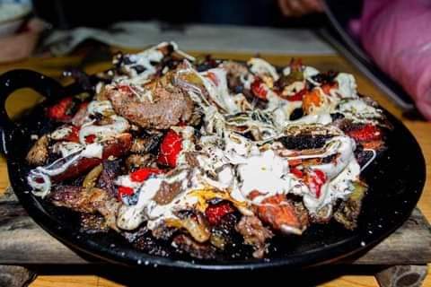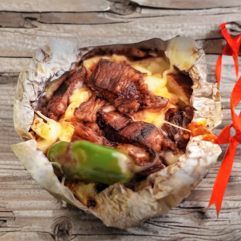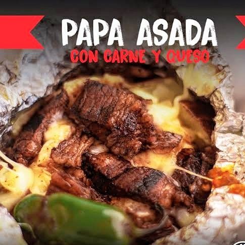 400 gr de papa cocida, ranch, carne asada, arrachera y chistorra, queso de hebra,queso manchego y todo se pone a fundir al carbón en papel aluminio.