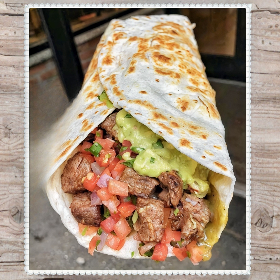 Burrito de la casa preparado con un mix de todas nuestras carnes, frijol, queso, carnes, porcion de pico de gallo y guacamole.