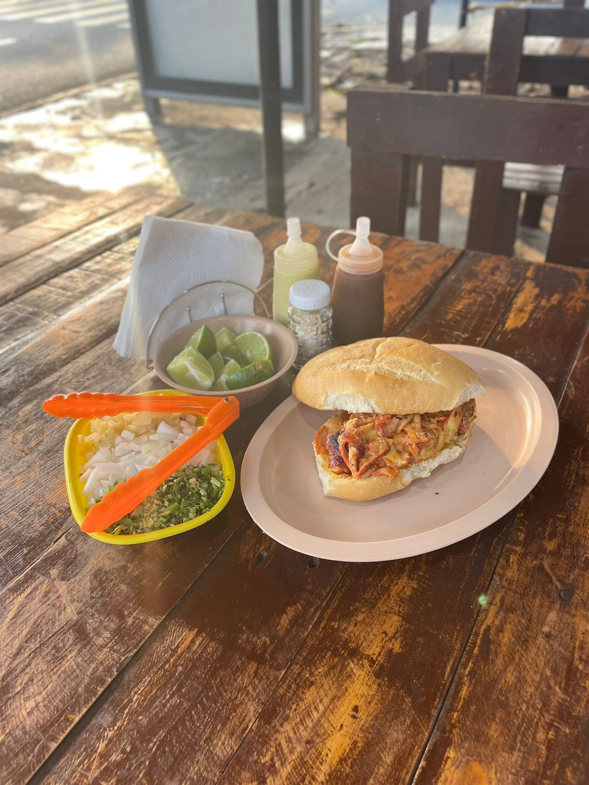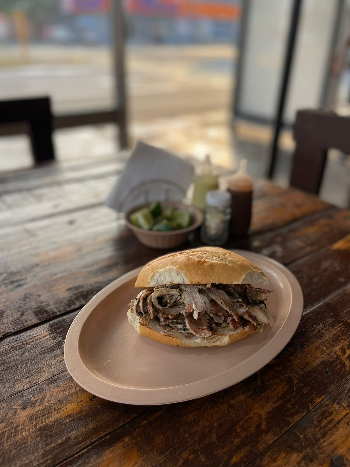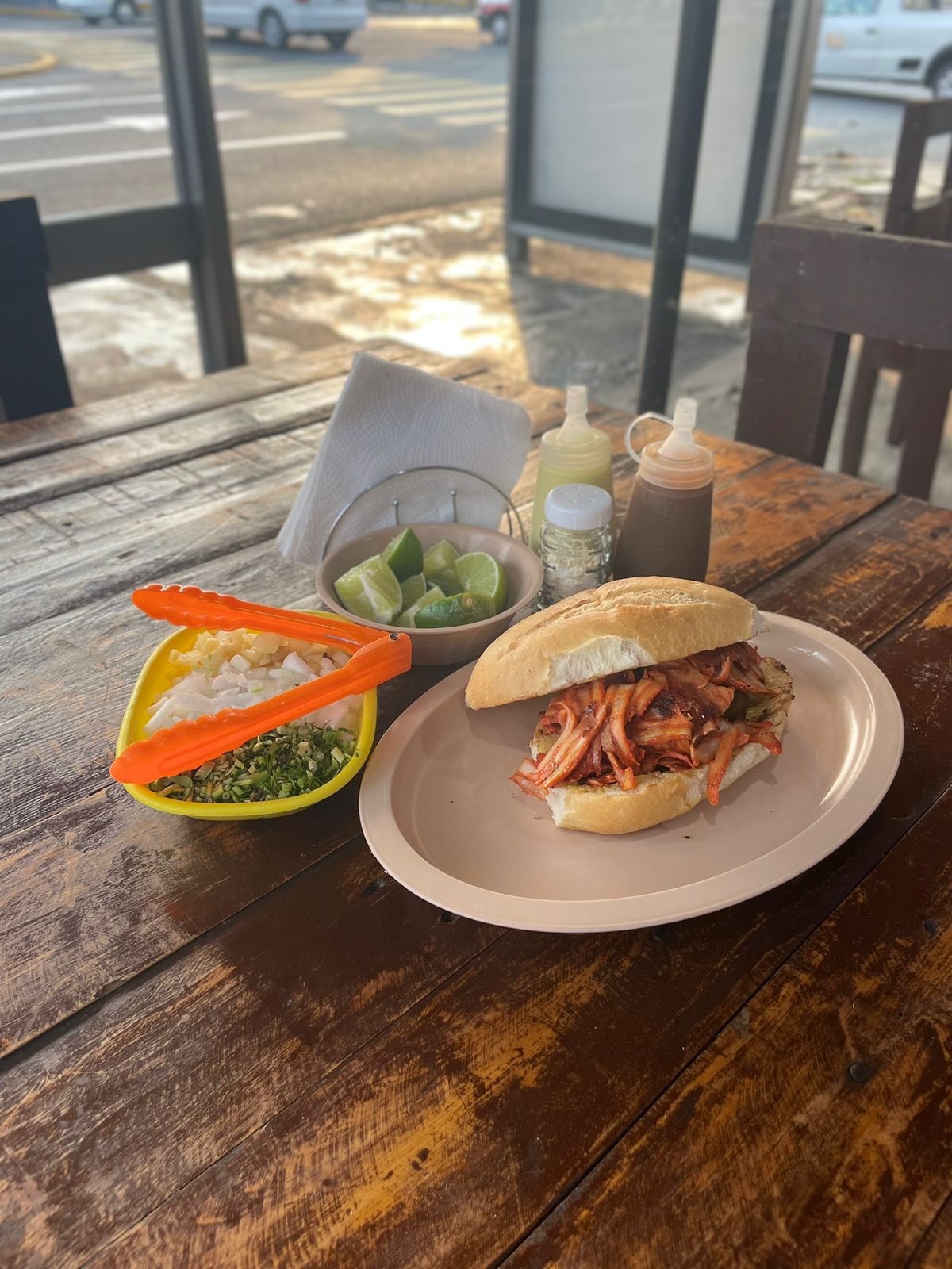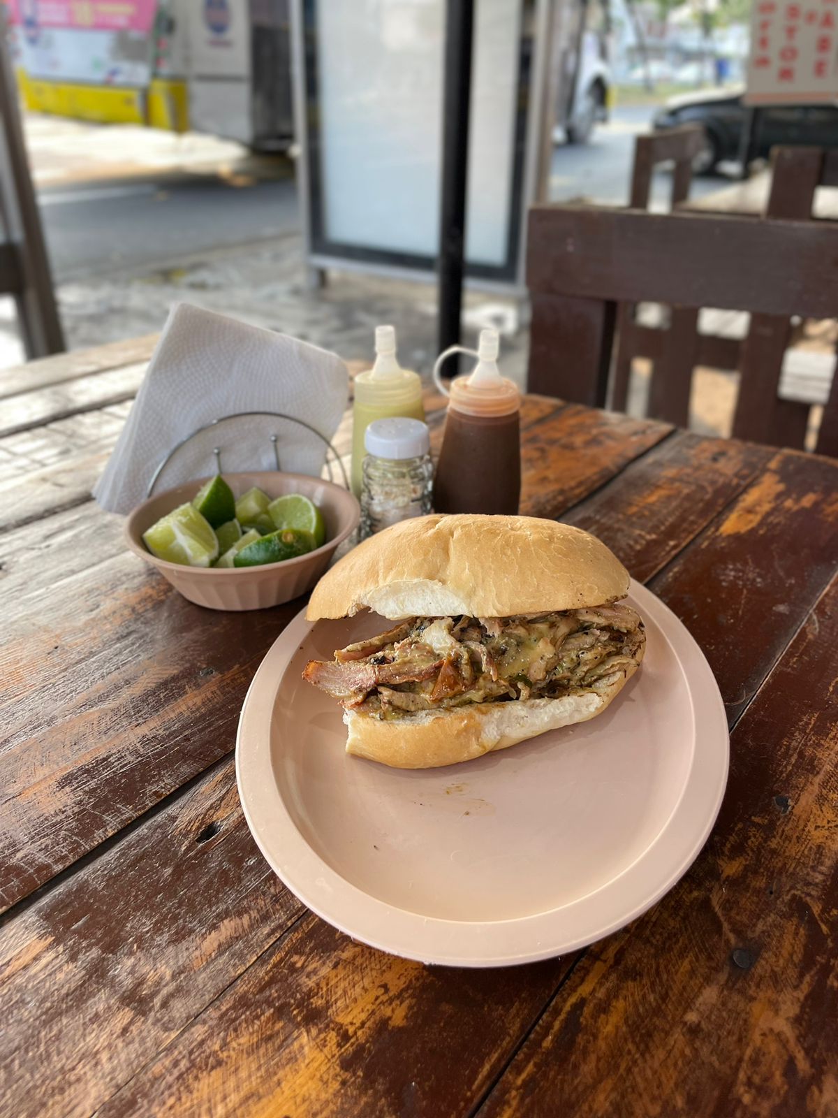 Torta con carne al pastor y salsa verde a base de habanero.