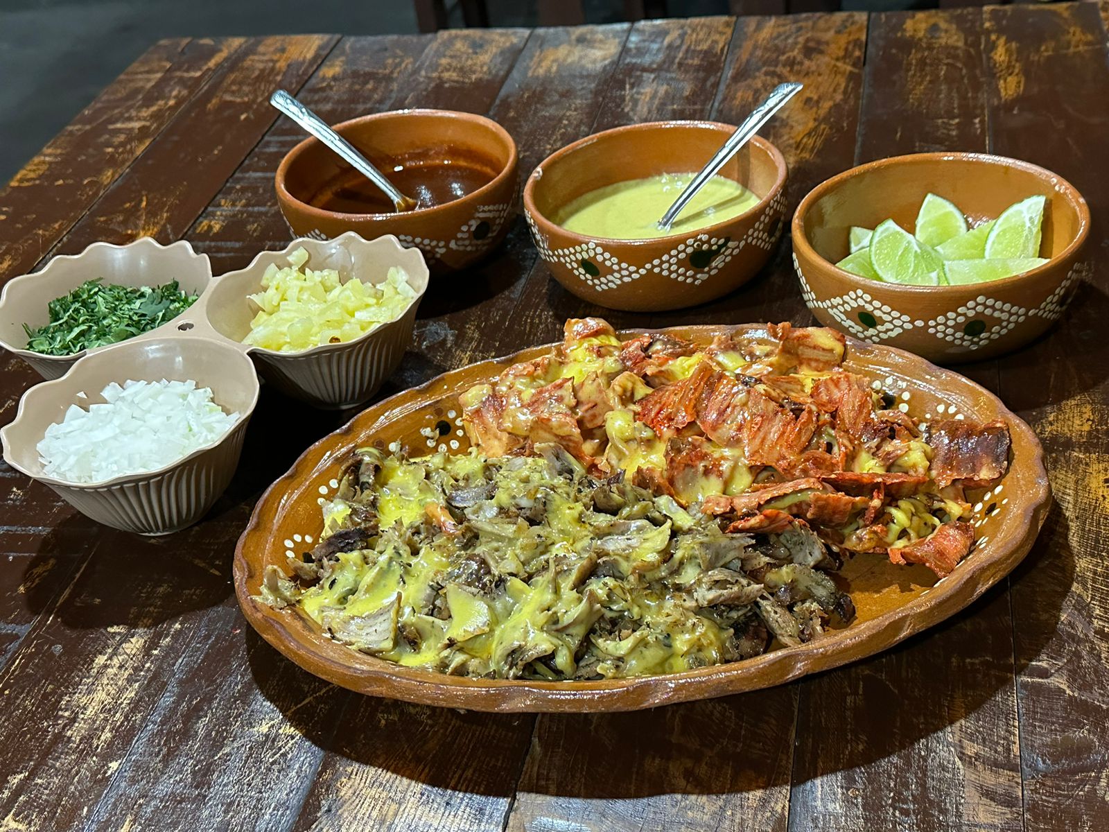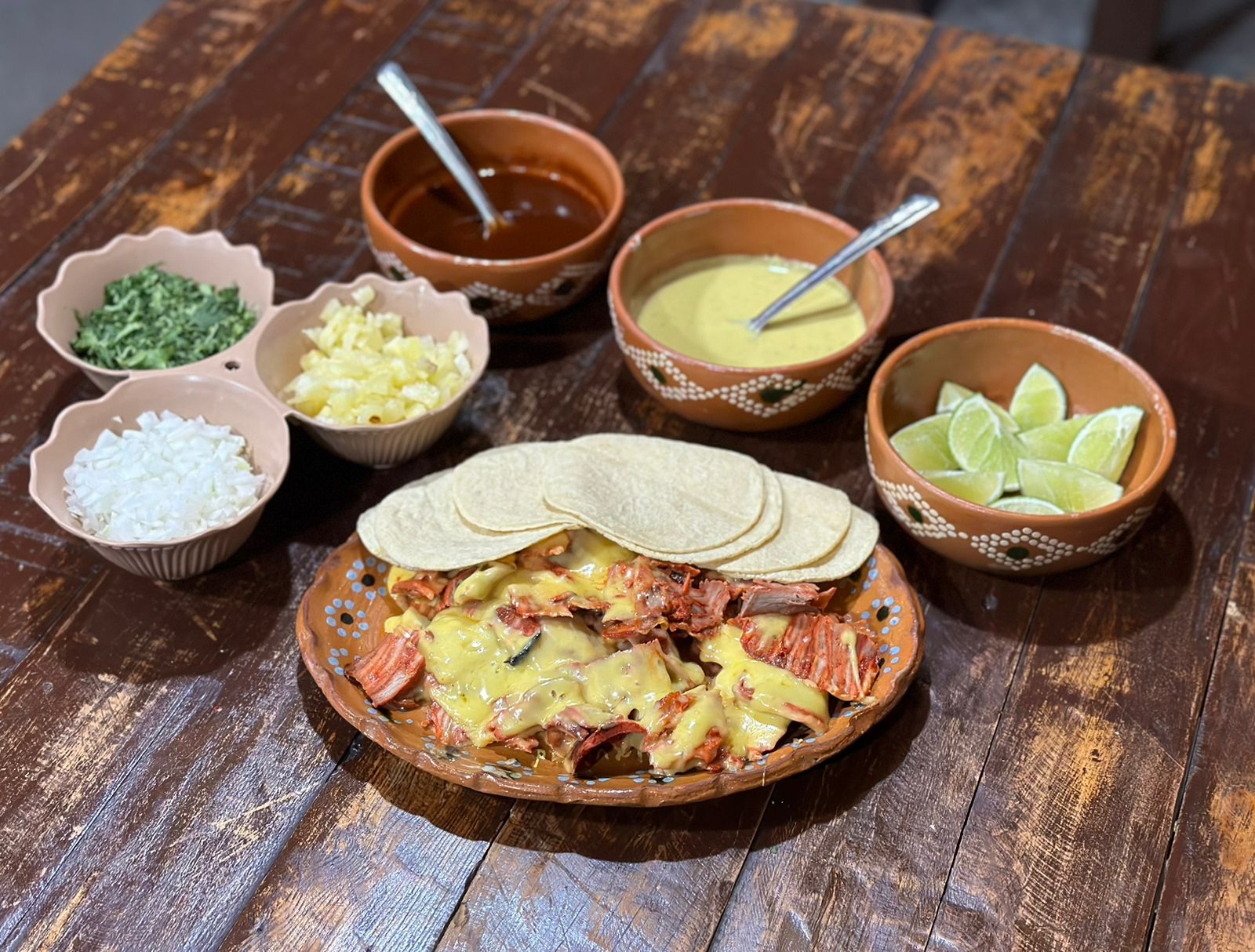 Medio kilo de carne al pastor con queso tipo gouda derretido 18 tortillas taqueras salsa de habanero piña cilantro cebolla y limones.