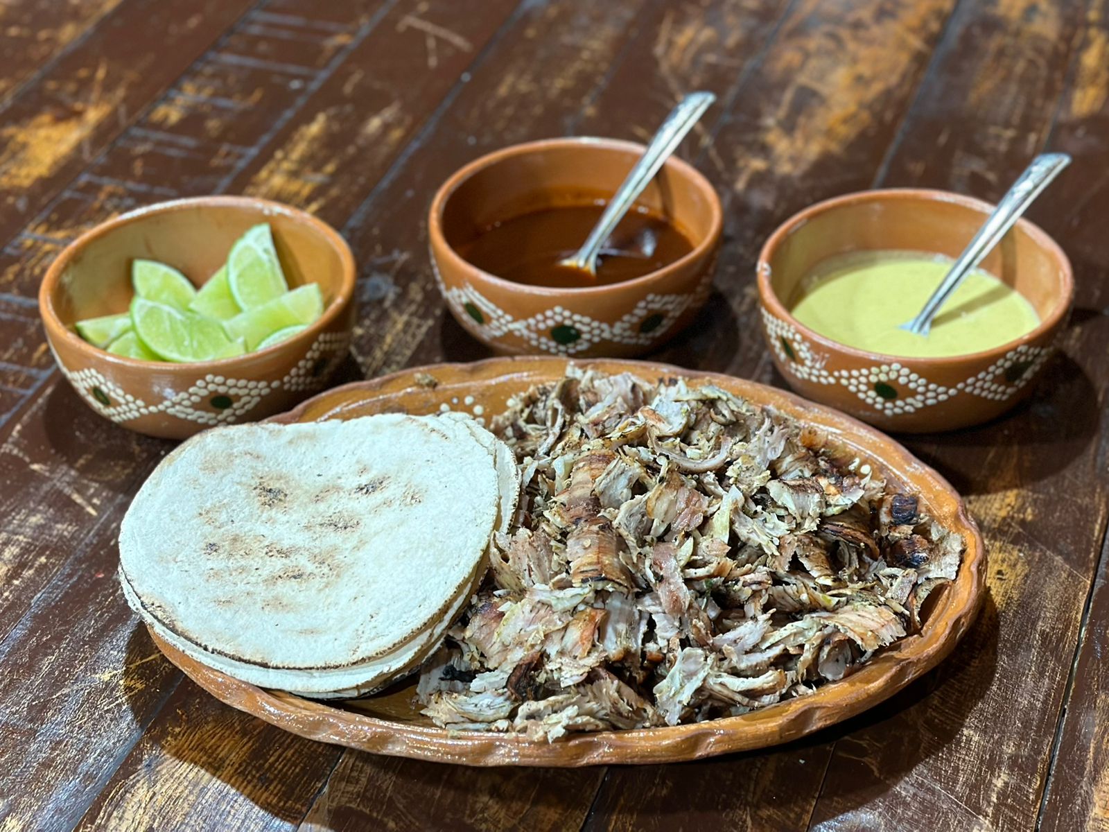 Un kilo de carne árabe con 10 tortillas de maíz, 4 tortillas de harina y 4 tortillas árabes con salsa a base de chipotle y limones.