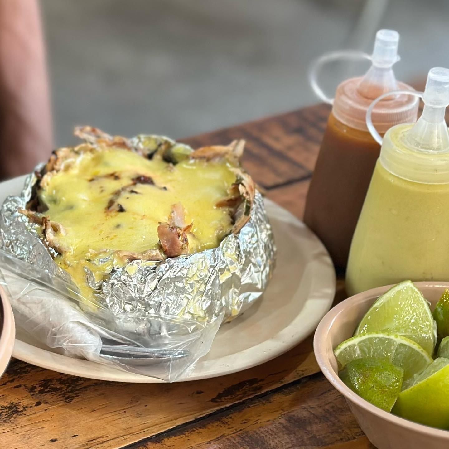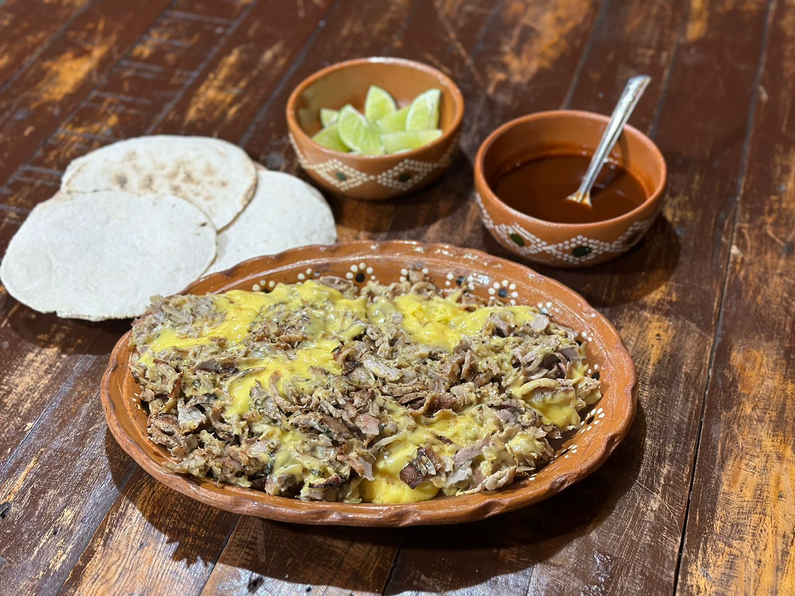 Un kilo de árabe con queso tipo gouda derretido con 10 tortillas de maíz, 4 tortillas de harina, 4 tortillas árabes con salsa a base de chipotle y limones.