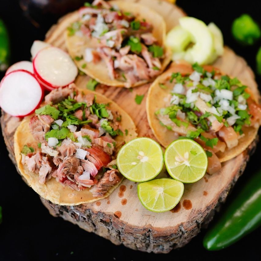 Tortilla de maíz doble rellena de costilla de cerdo, cebolla, cilantro y limón.