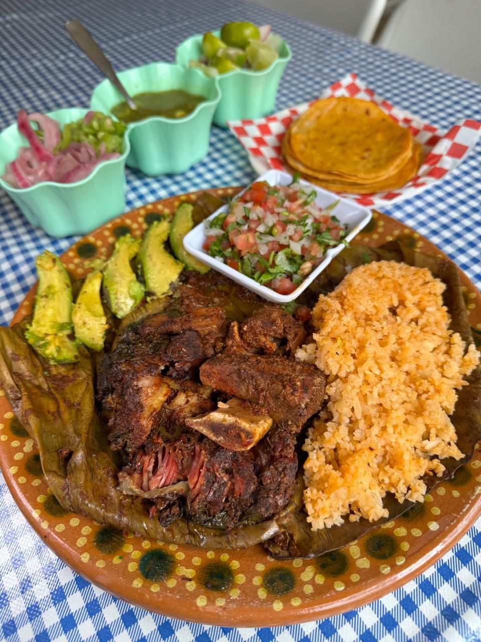 Barbacoa de res acompañada de arroz, consome, pico de gallo y tortillas.