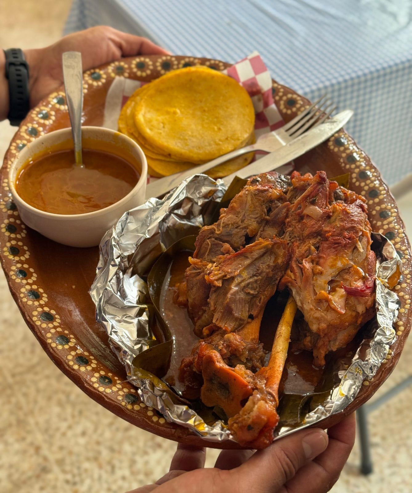 Chamorro de barbacoa o pibil acompañados de tortillas, consomé o caldo.