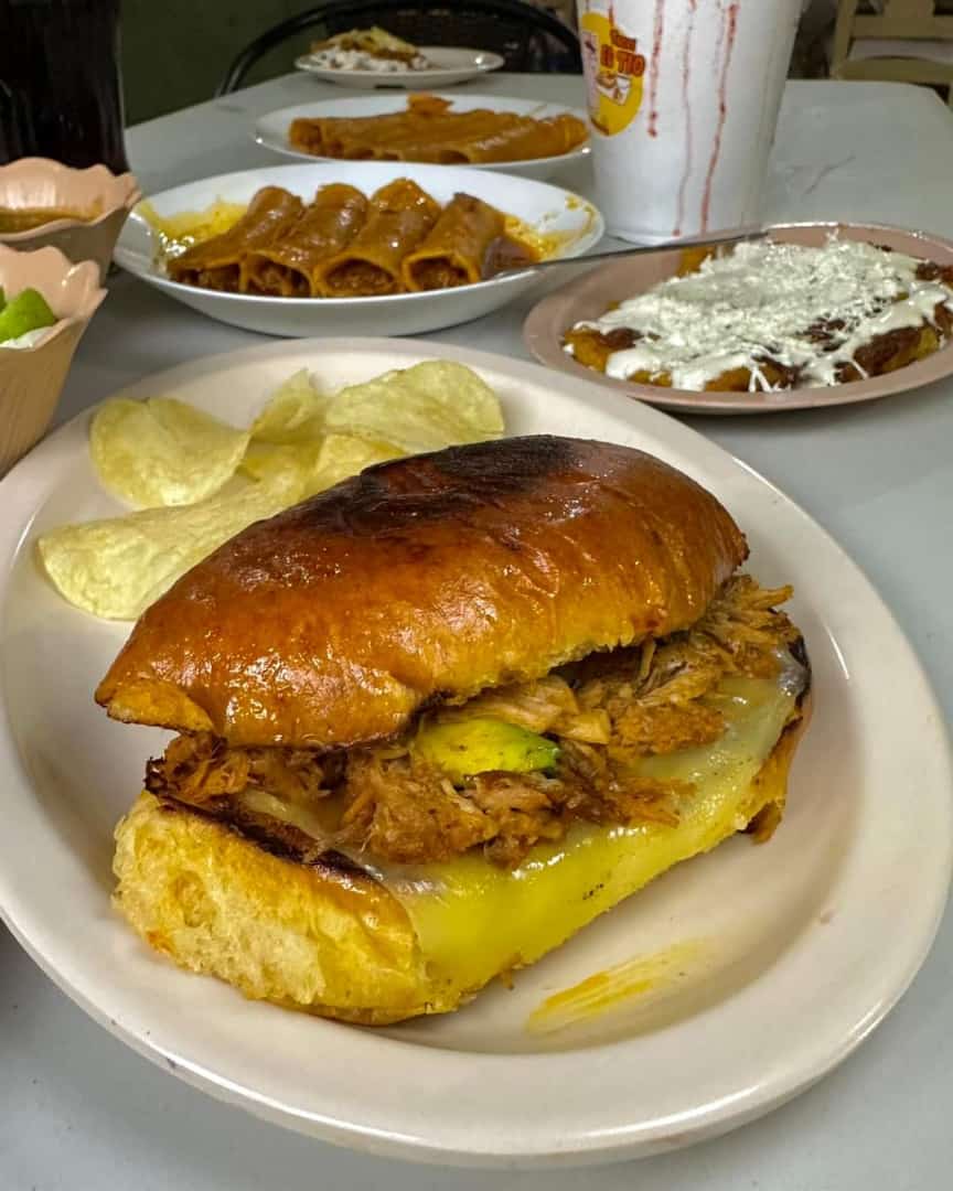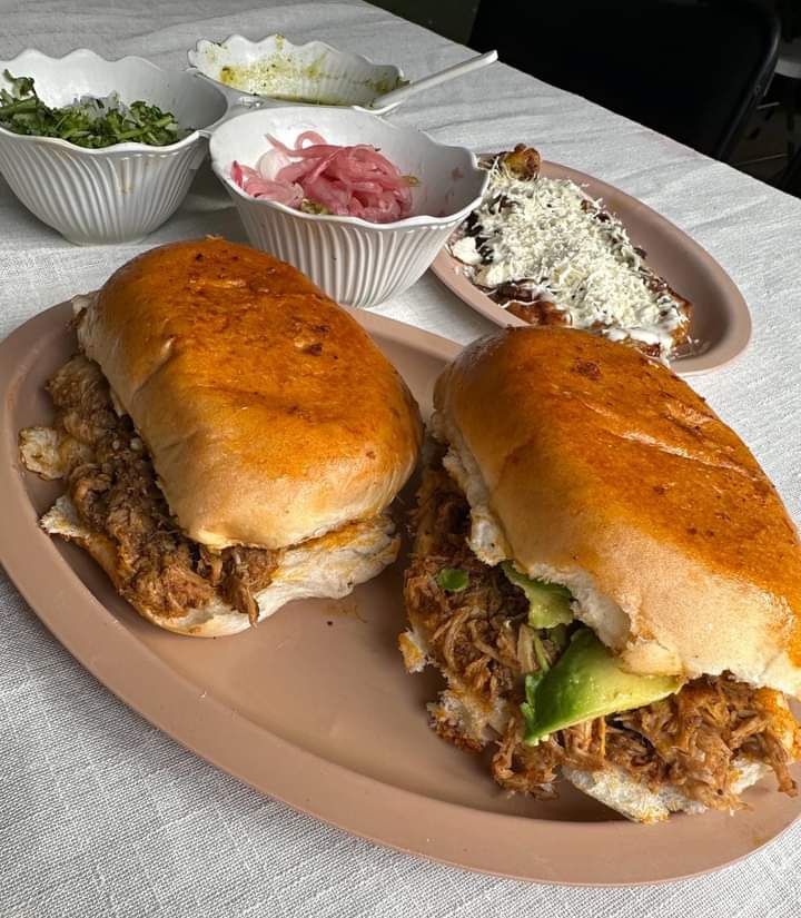 Pan de sal con el guiso que sea de tu preferencia; pibil, chamorro, barbacoa, chicharrón prensado o cueritos.