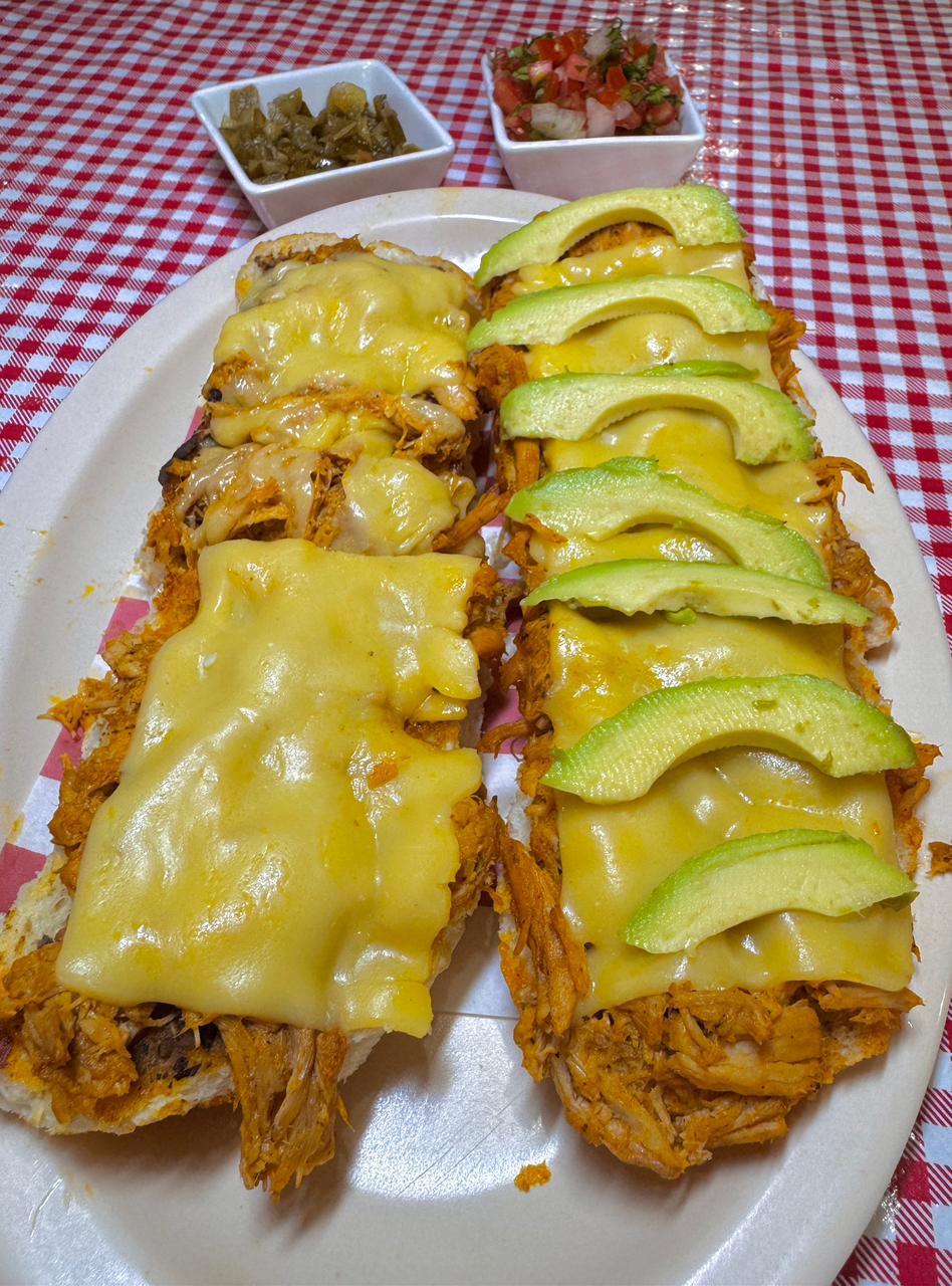 Pan con toque dulce queso manchego, aguacate y chamorro de pibil acompañada de papas fritas.