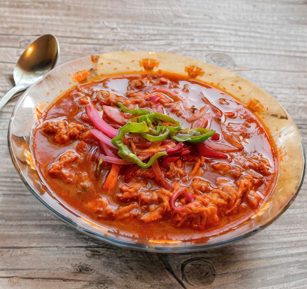 Exquisito consomé de pibil. Ingredientes carne de pibil, cebolla morada, chile habanero y caldo de pibil.
