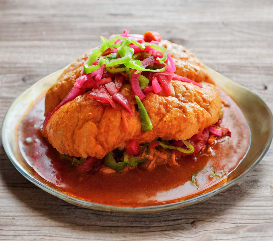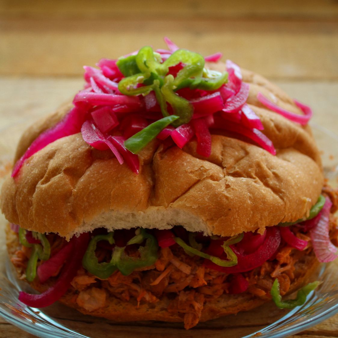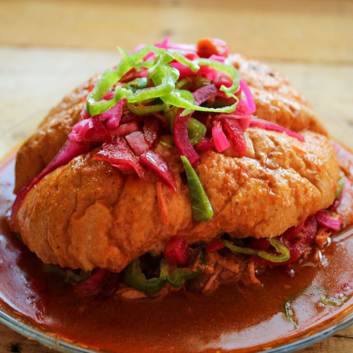 Exquisita torta de pibil seca. Ingredientes, torta telera, mayonesa, carne de pibil, cebolla morada, chile habanero y ahogada en caldo de pibil.