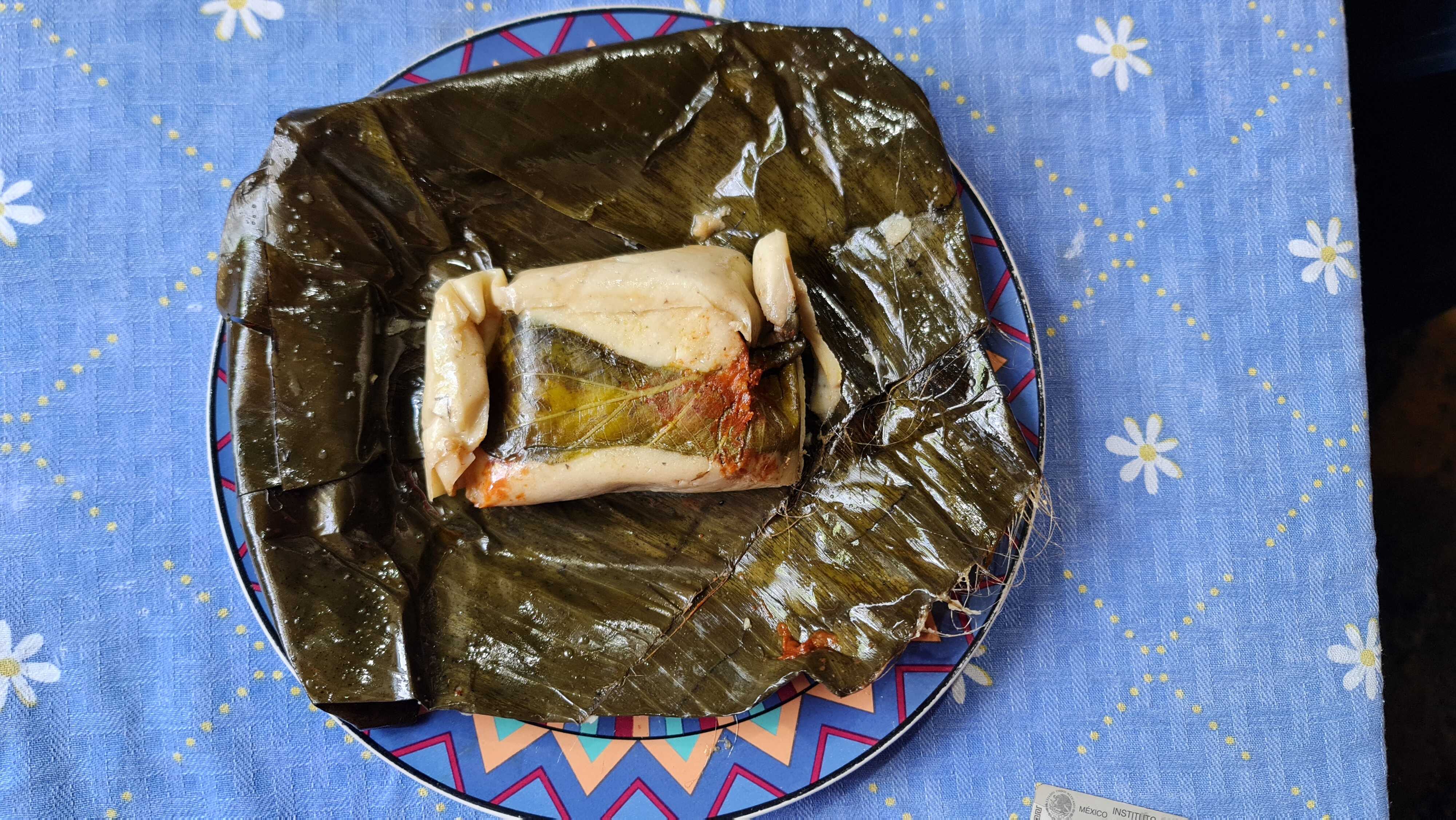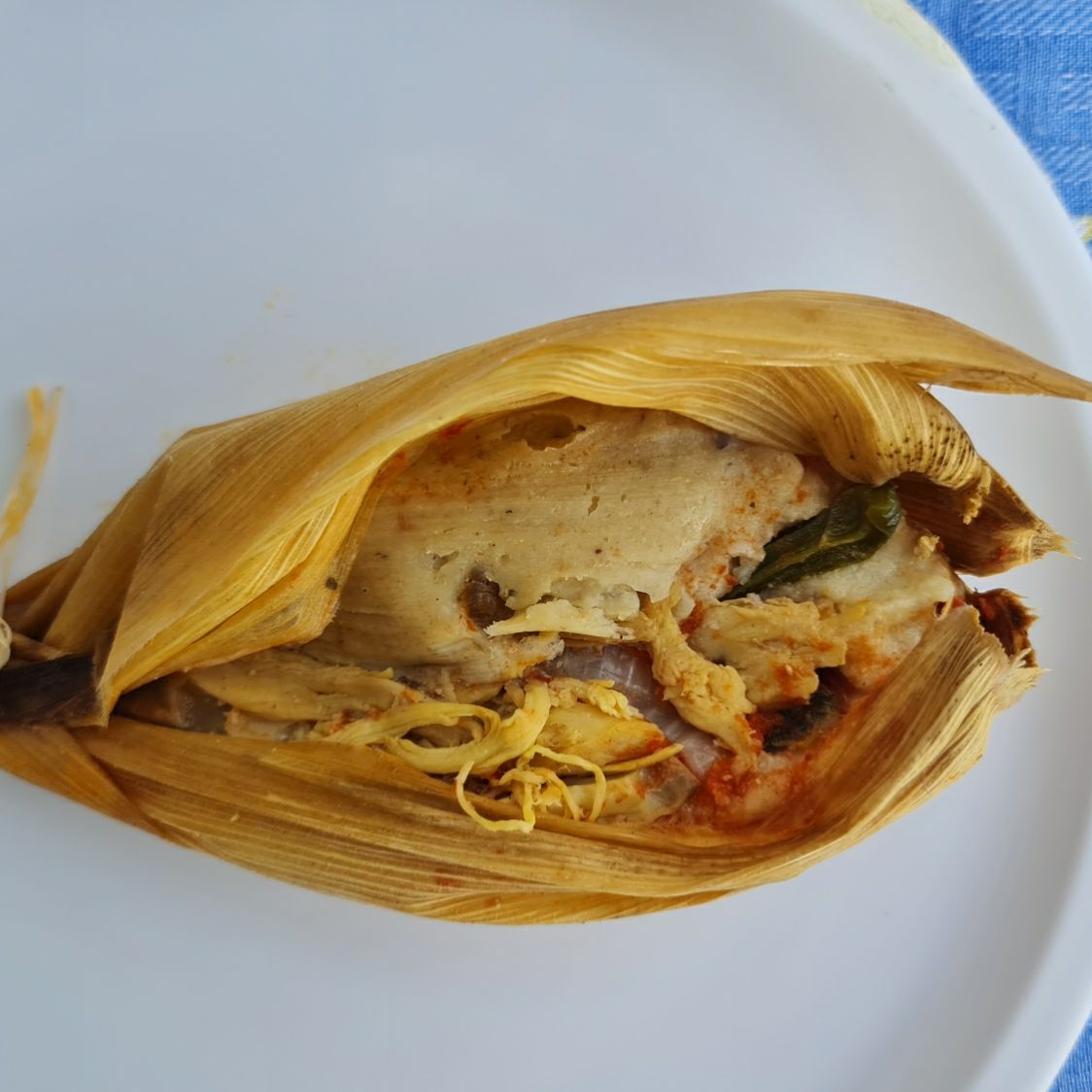 Suave tamal de maíz cernido por dentro salsa de jalapeño, cebolla, tomate y pollo.