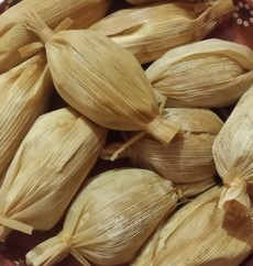Suave tamal preparado con granos de elote frescos, envuelto en hoja de elote.
