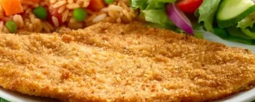 Rica milanesa de pollo empanizado, acompañada de arroz, tortilla, ensalada y vaso de agua de 500 ml.