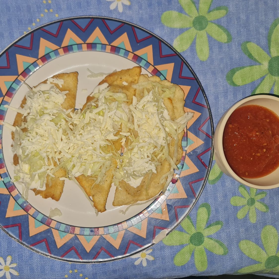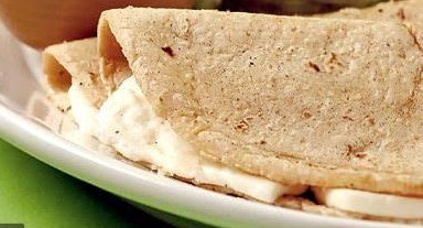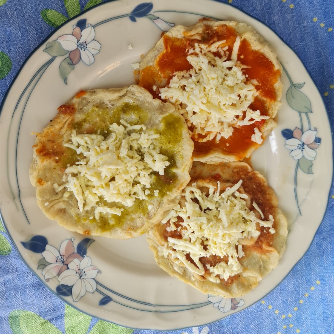 Tortilla a mano doblada, por dentro queso y un guiso.