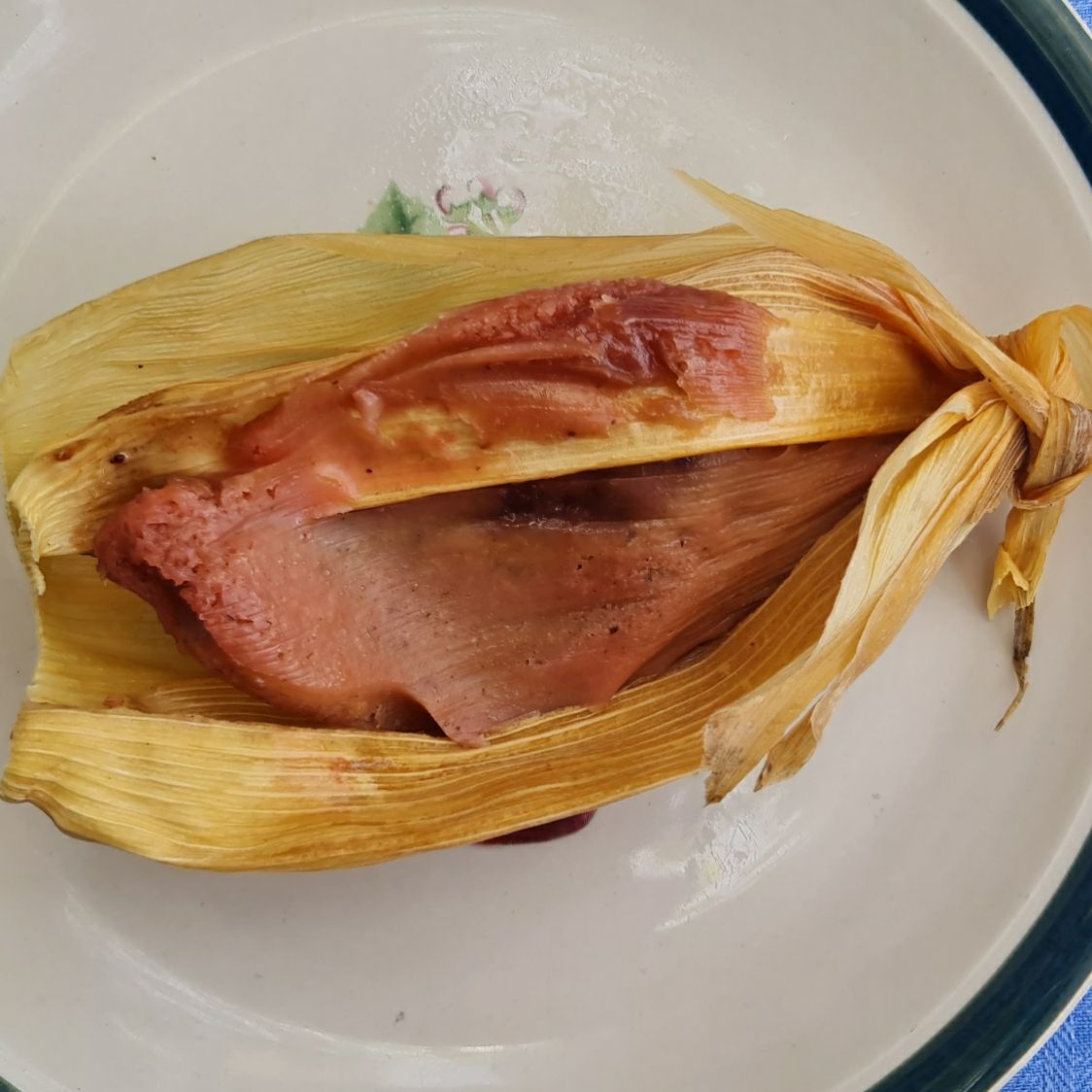 Tamal preparado con granos de elote frescos, por dentro carne de puerco, envuelto en hoja de elote.