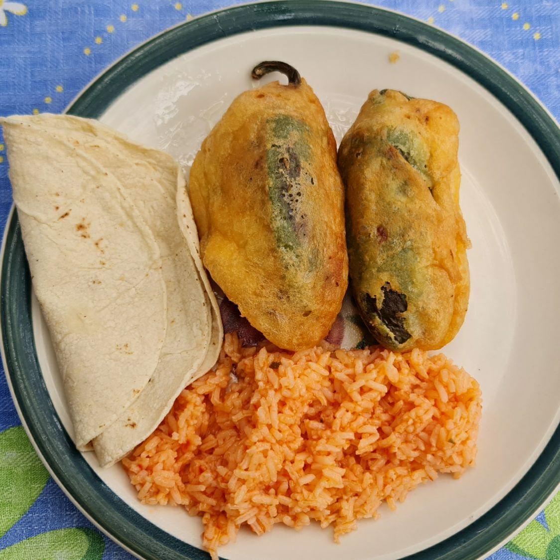 Chile relleno de un guisado a elegir, acompañado de arroz y tortilla.