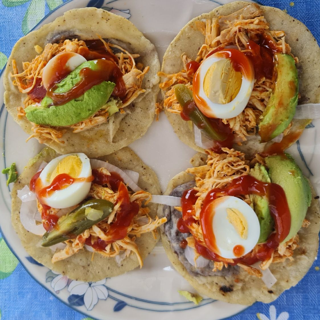 Tradicionales panchos elaborados con tortilla a manos por dentro frijol, arriba pollo, huevo, cebolla, aguacate, rajas y catsup.