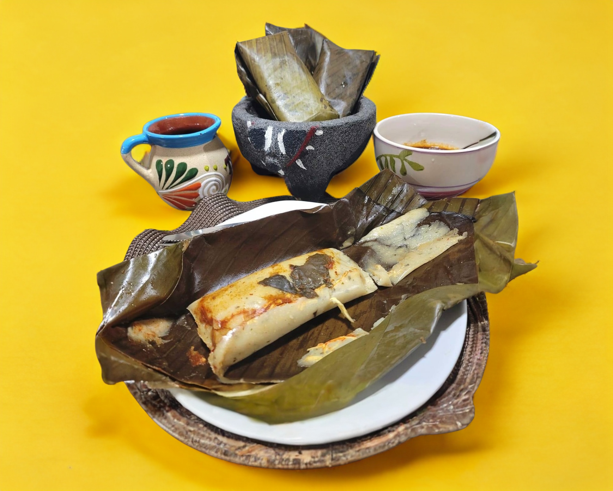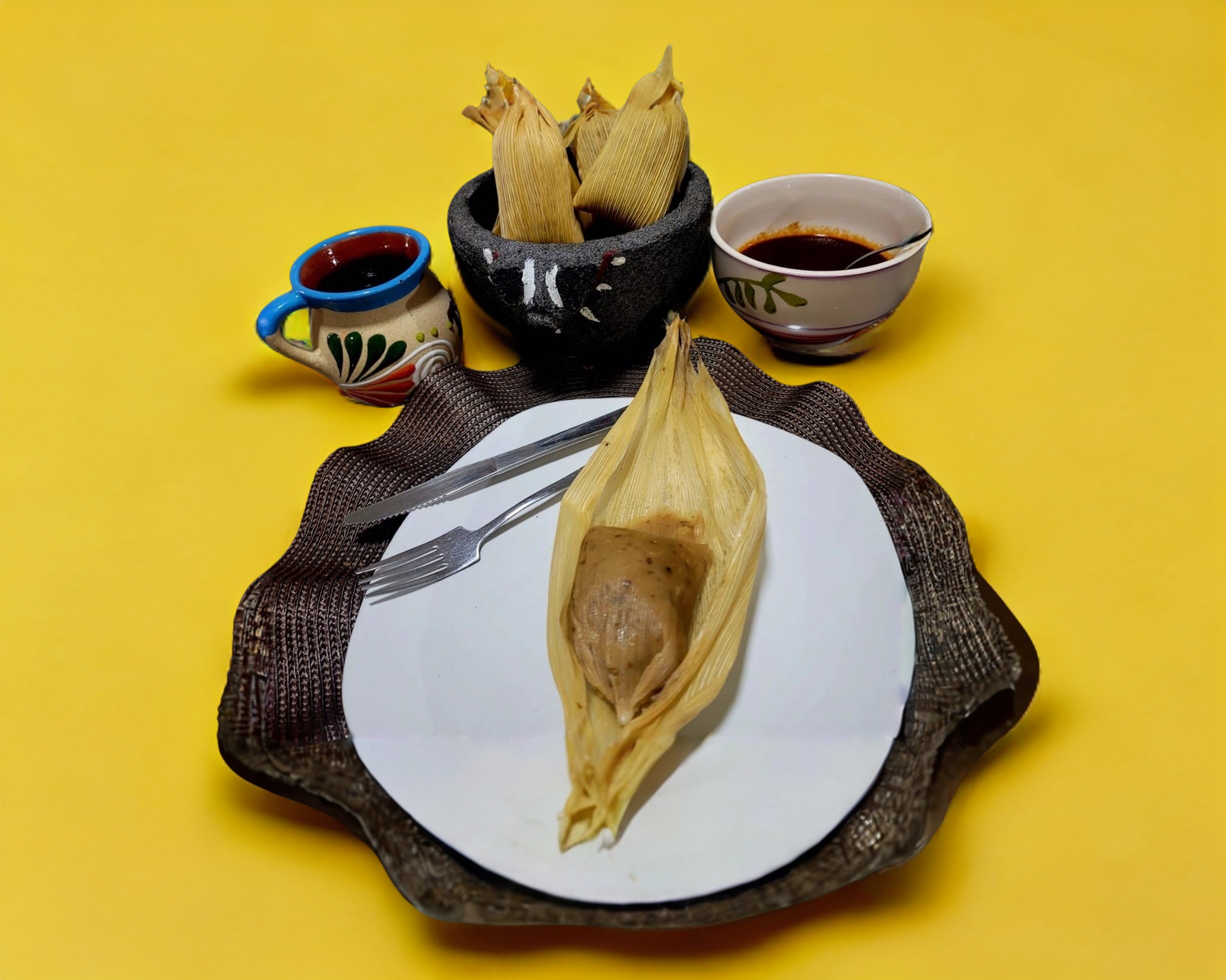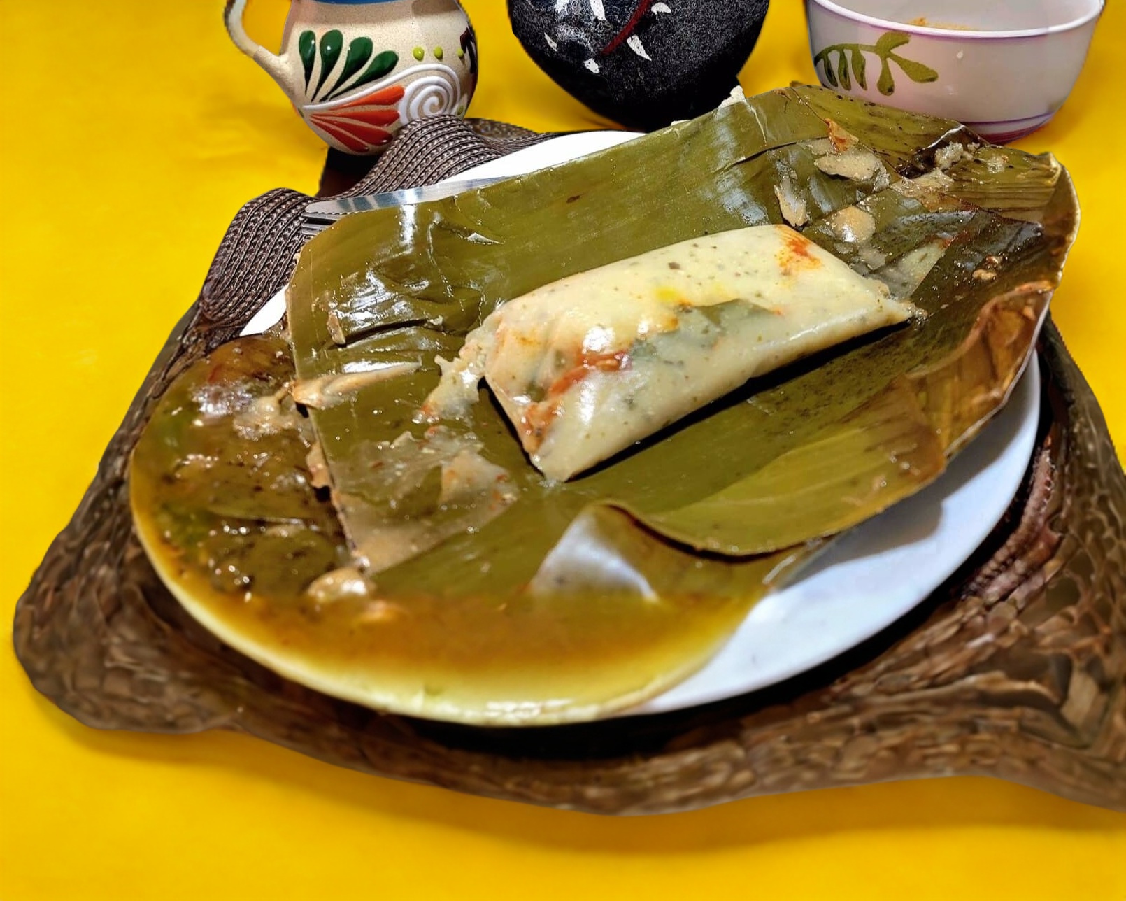 1 Tamal a base de masa de maíz con un trozo de puerco, acompañado de salsa roja.