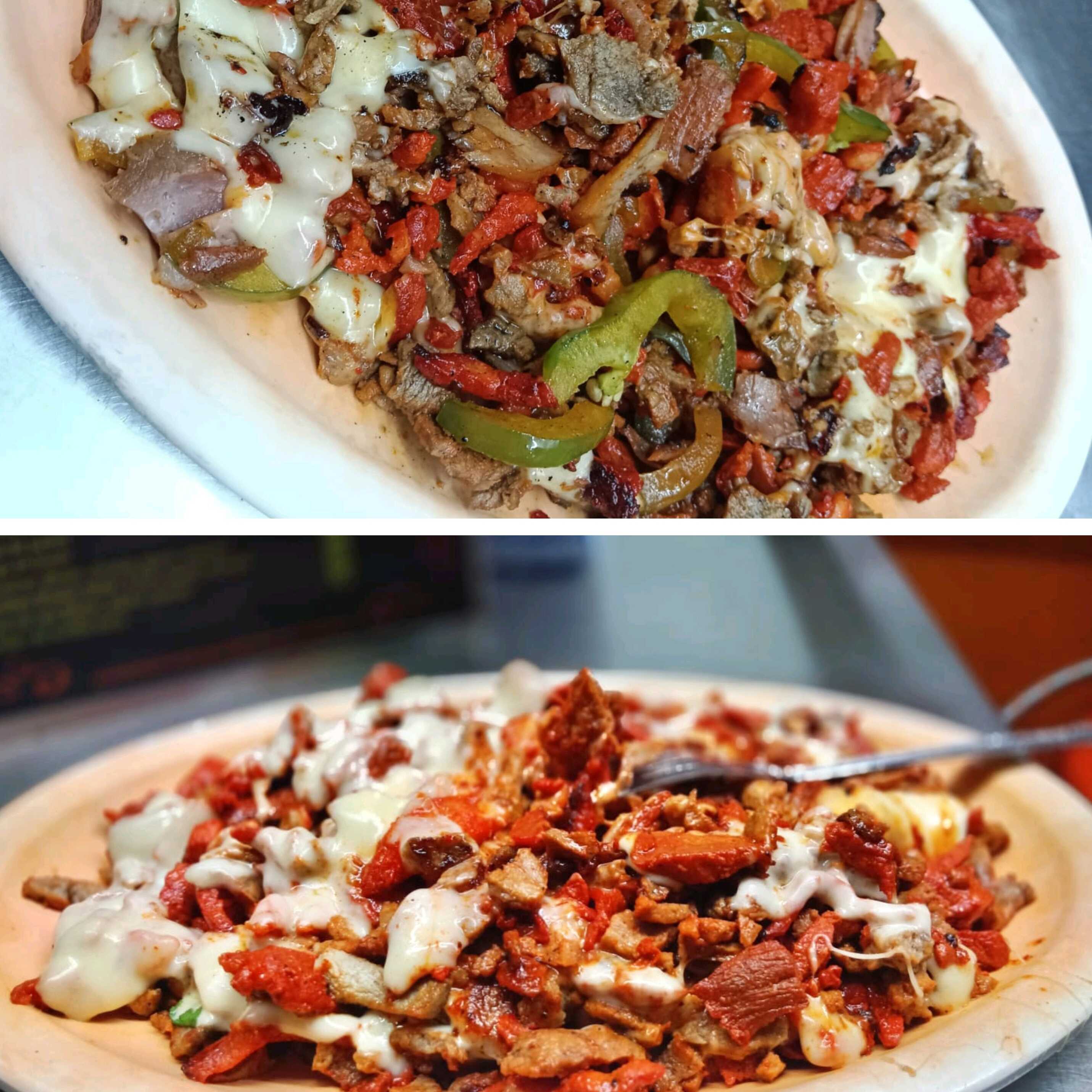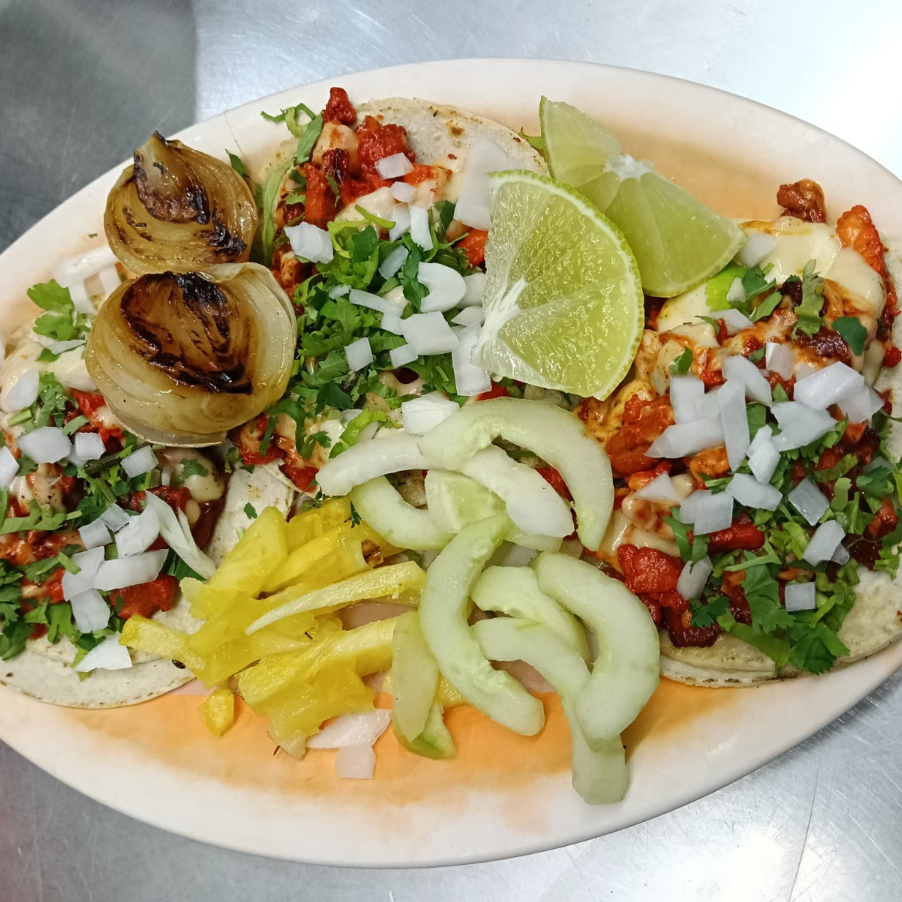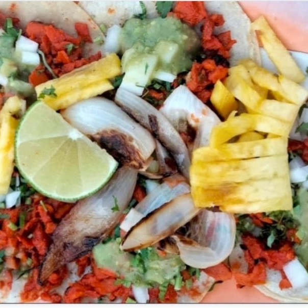 Carne al Pastor, piña, queso manchego, cebolla, jitomate, aguacate y aderezo