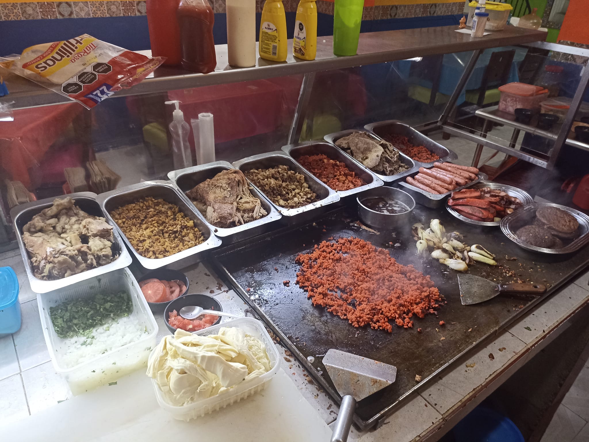 Queso, Tocino, Cebolla, Tomate, Capsup, Mostaza, Mayonesa.