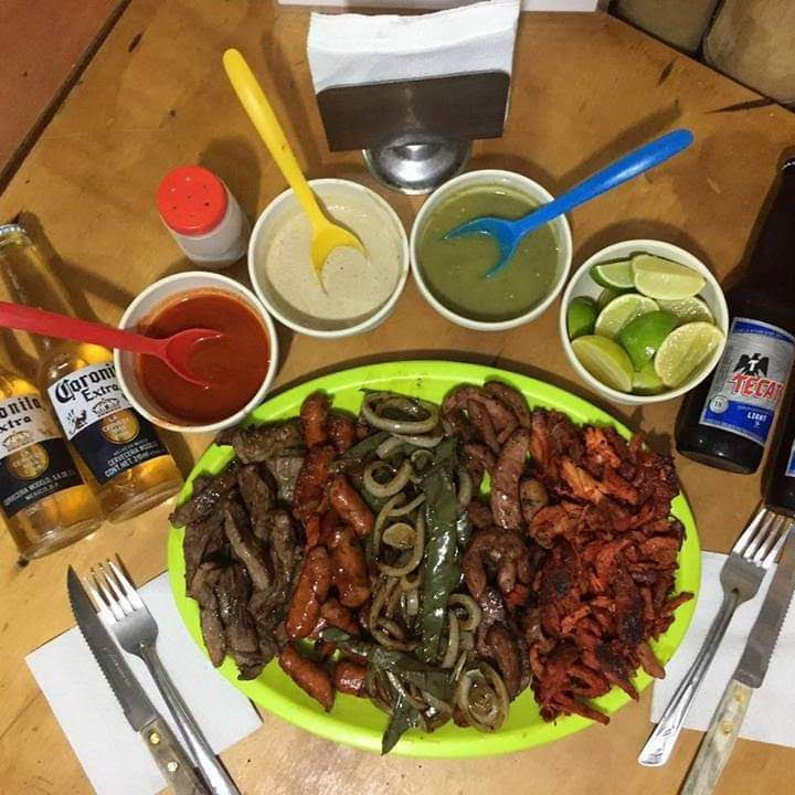 Arrachera, pimiento,pastor, tocino, champiñones, cebolla, queso, tortillas (4 personas).