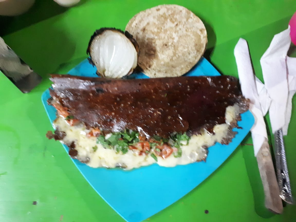 Tortilla de harina mega,tocino,pimiento,cebolla,carne de elección,champiñones gratinado con queso gouda y 5 tortillas de maíz (500gr).