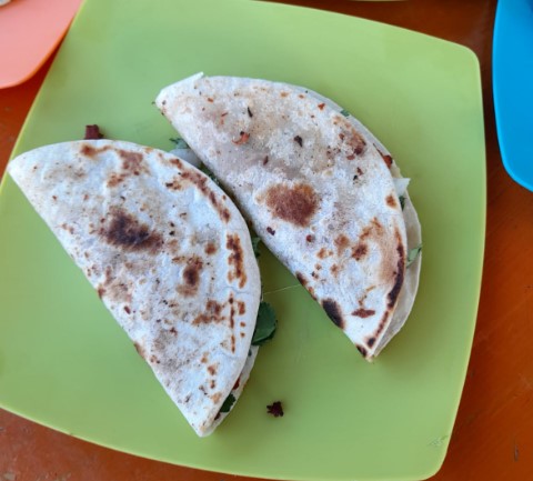Dos tortillas de harina con queso manchego y asada.