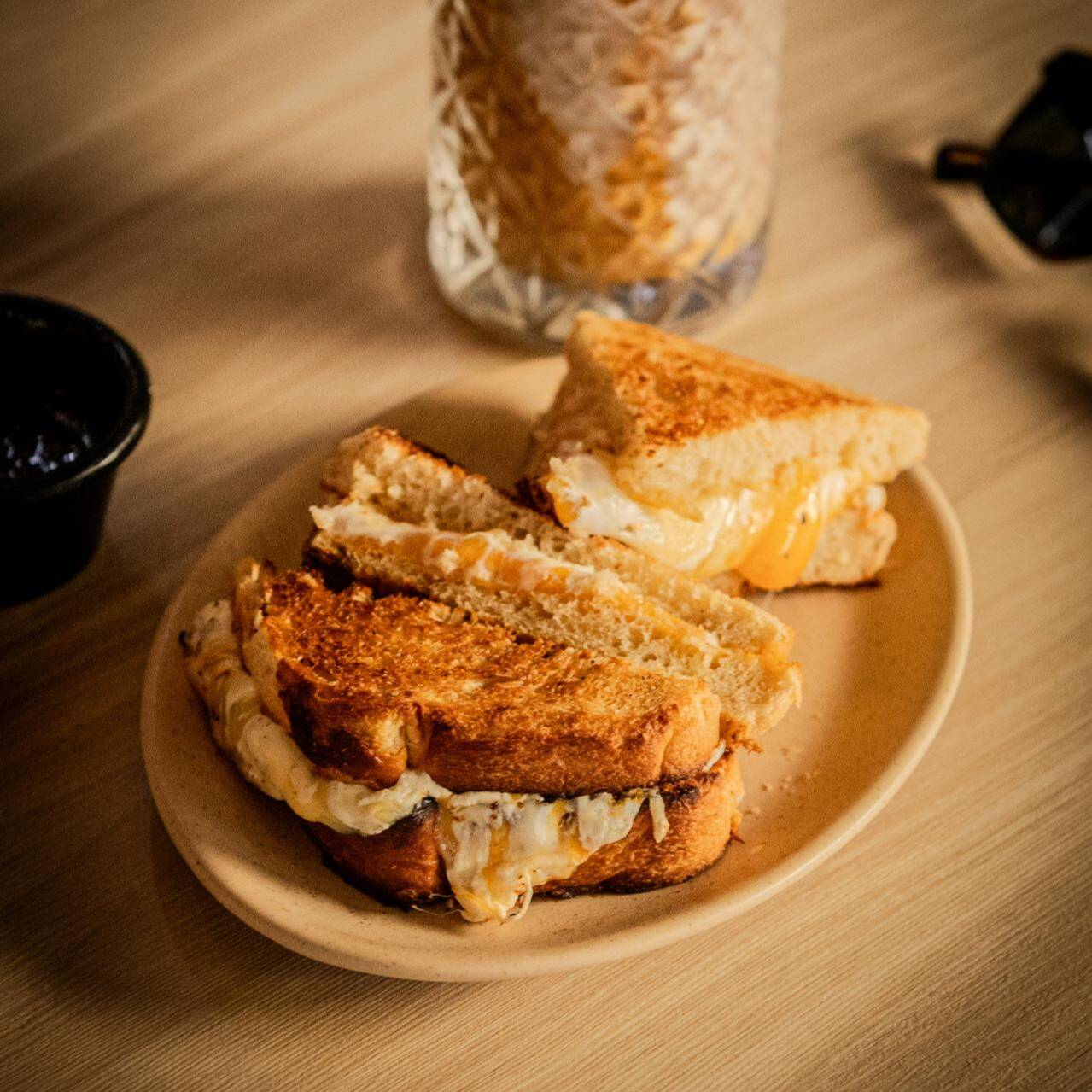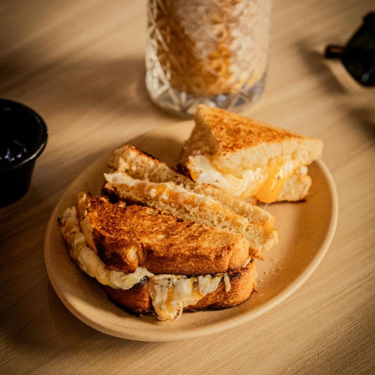 "Grilled cheese sandwhich” pan de caja mix de quesos (cheddar, gouda, mozarella) salsa de queso de cabra y queso crema. Pan italiano crujiente tradicional de la toscana y umbria, elaborado con la receta de la casa.