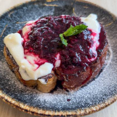 Crujiente base de mantequilla y galleta lotus estilo biscoff, con una superficie cremosa de vainilla o chocolate y crocante de caramelo, acompañada de frutos rojos aliñados, limón, menta y miel.