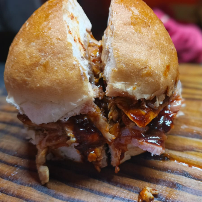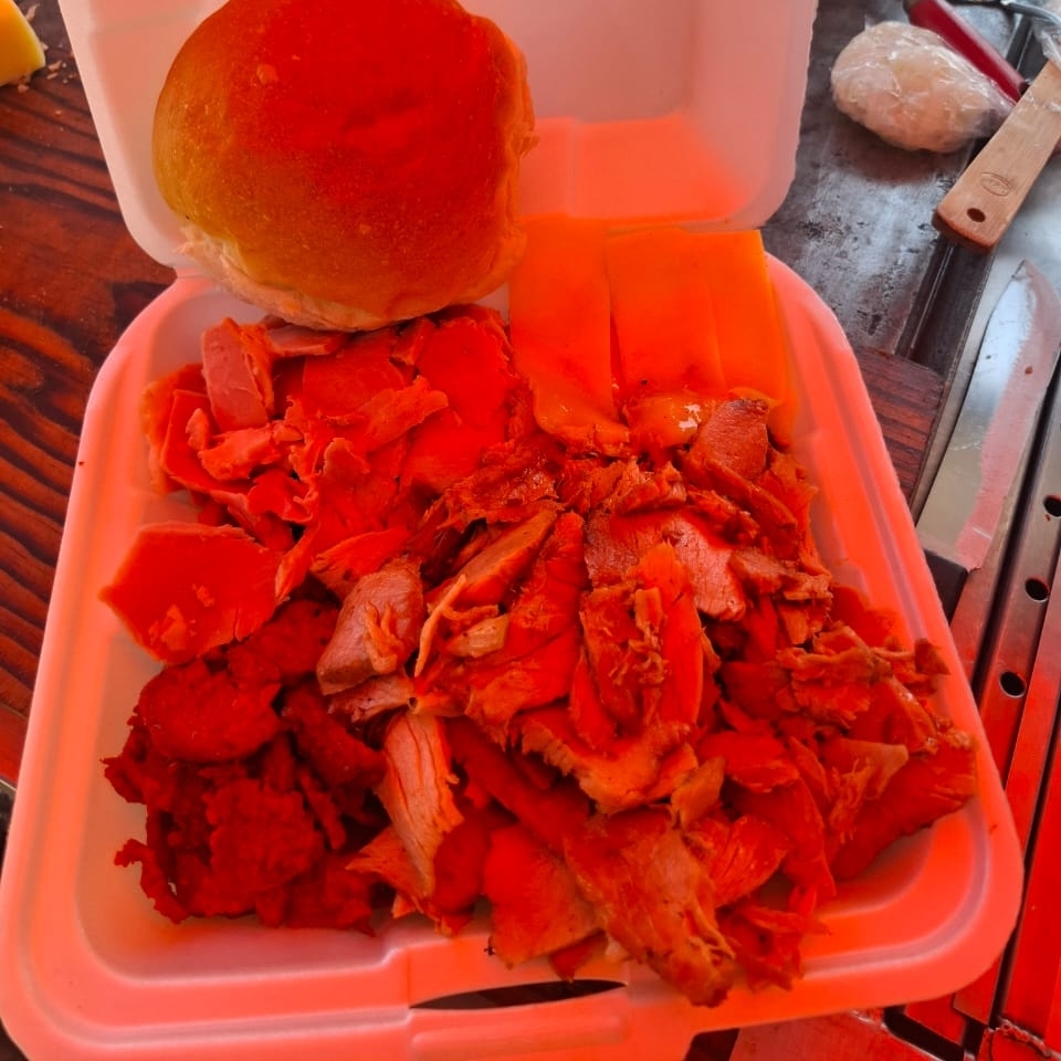 Porcion personal:(250g) pierna enchilada,cebolla,Cátsup,cama de frijoles en el pan(los chiles van aparte)