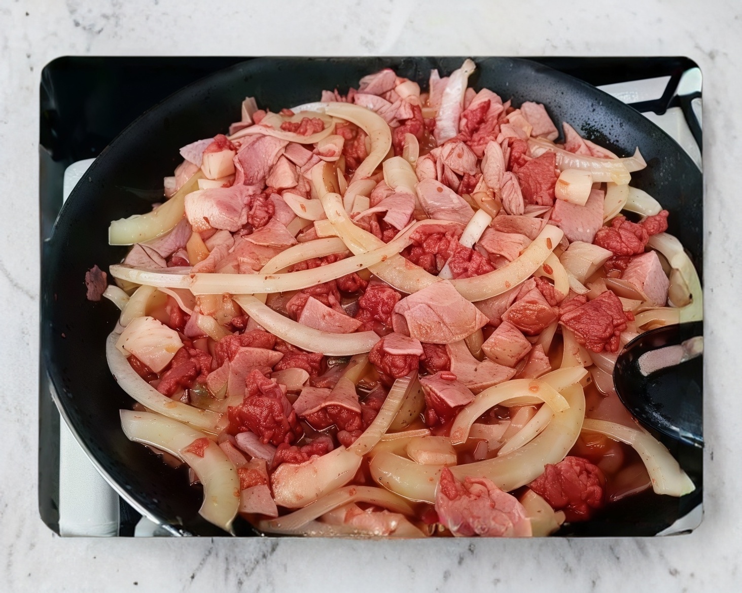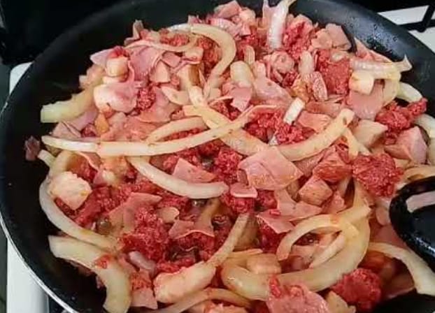 carne de puerco 250 gr, frijoles, cebolla y katsu.