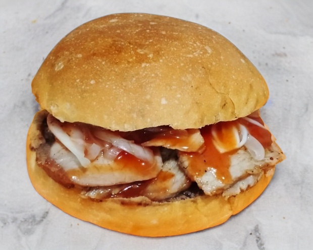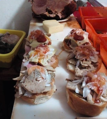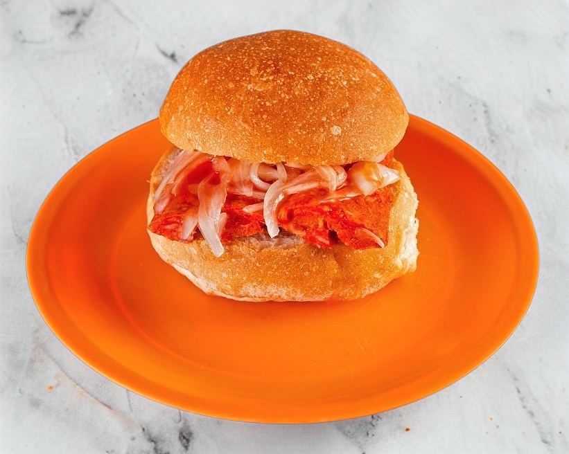Pan suave con frijoles, jamón enviando, pierna enchilada, queso gouda, cebolla y catsup