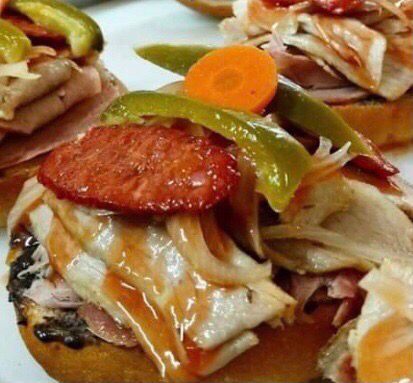 Jamón envinado, pierna, chorizo, queso, cebolla y chiles.