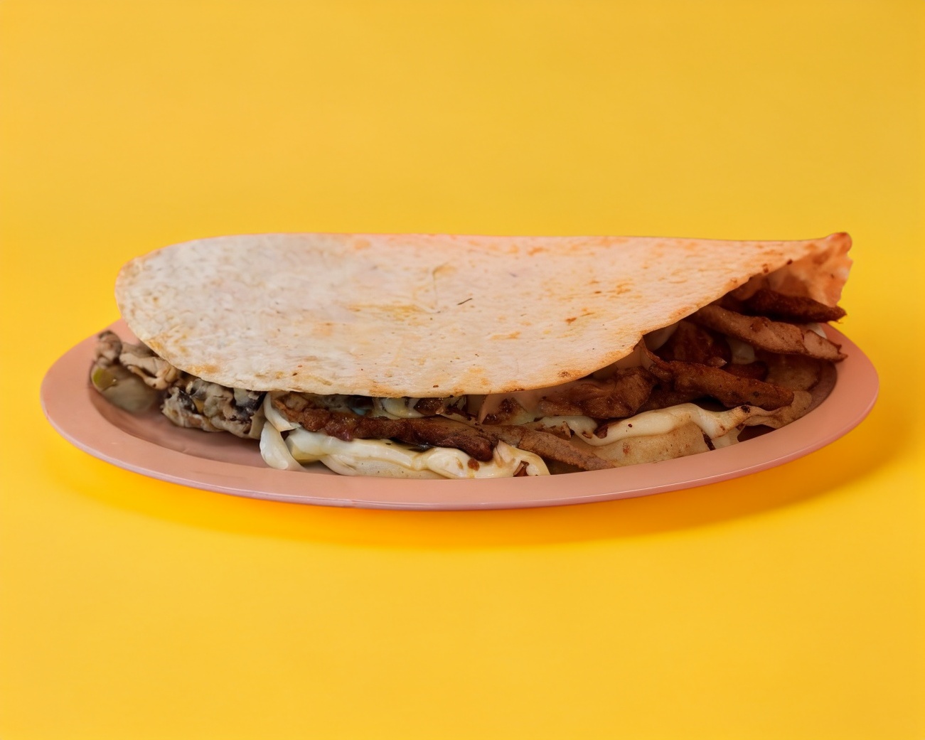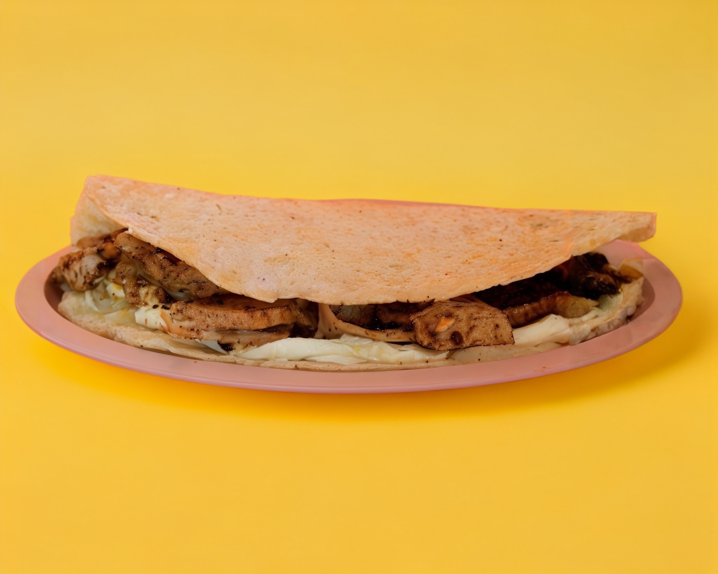 Tortilla de maíz hecha a mano con milanesa en tiras (preparada en la plancha con mantequilla y adobo) y queso