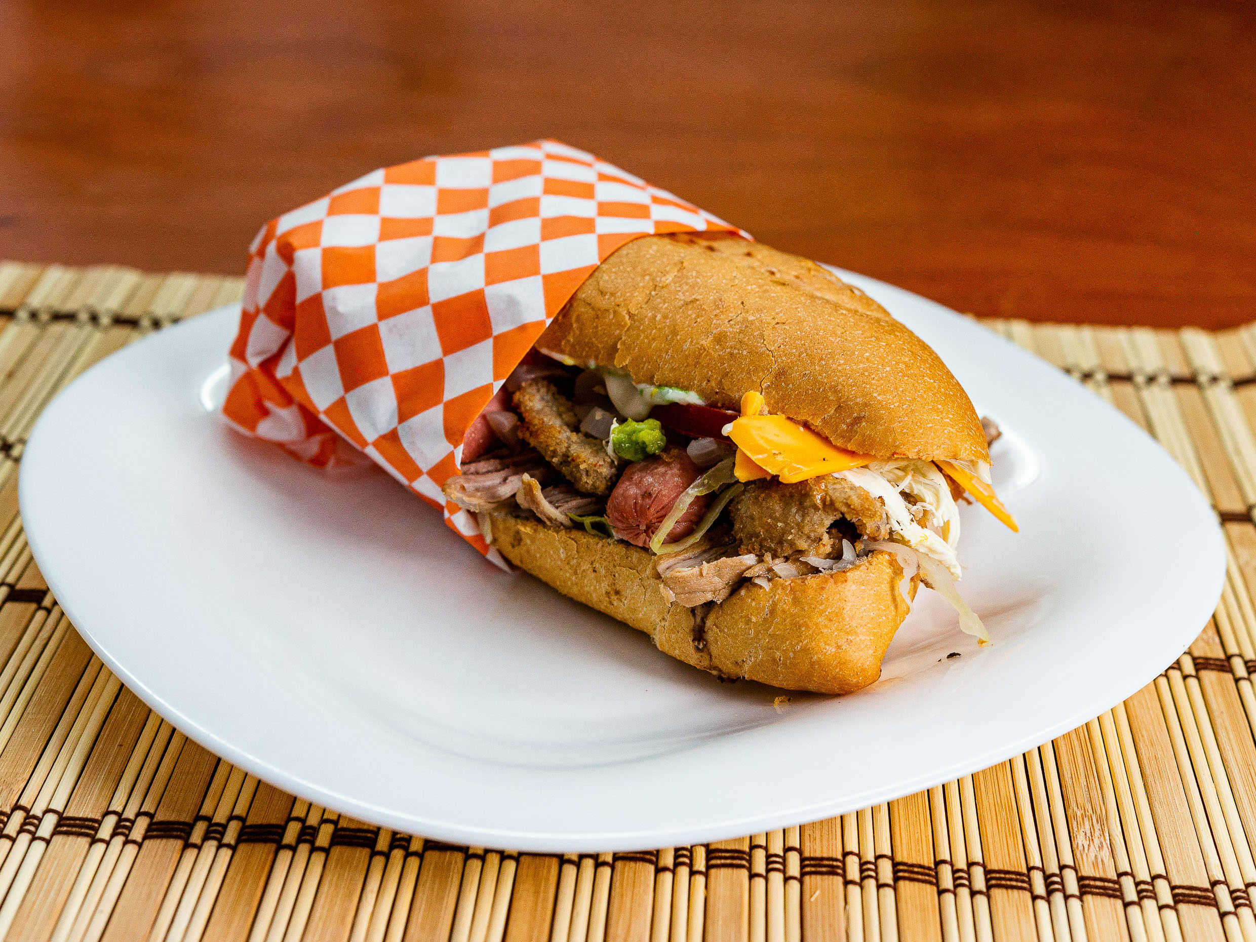 PIERNA DE CERDO, MILANESA EMPANIZADA, SALCHICHA, JAMON, QUESO HEBRA, AMARILLO, FRIJOLES, MAYONESA, CEBOLLA PREPARADA, COL PREPARADA, TOMATE, AGUACATE, CHIPOTLE DULCE.