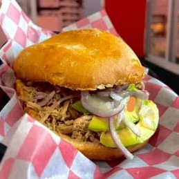 Torta en pan tipo telera, sellado con mantequilla, untado con mayonesa, con carde de lechon cubano con cebolla morada curtida y rebanadas de aguacate, preparacion al estilo cubano, acompañado con salsa verde.