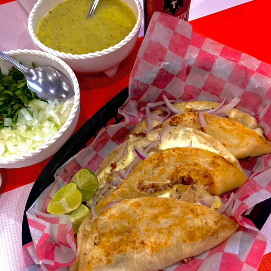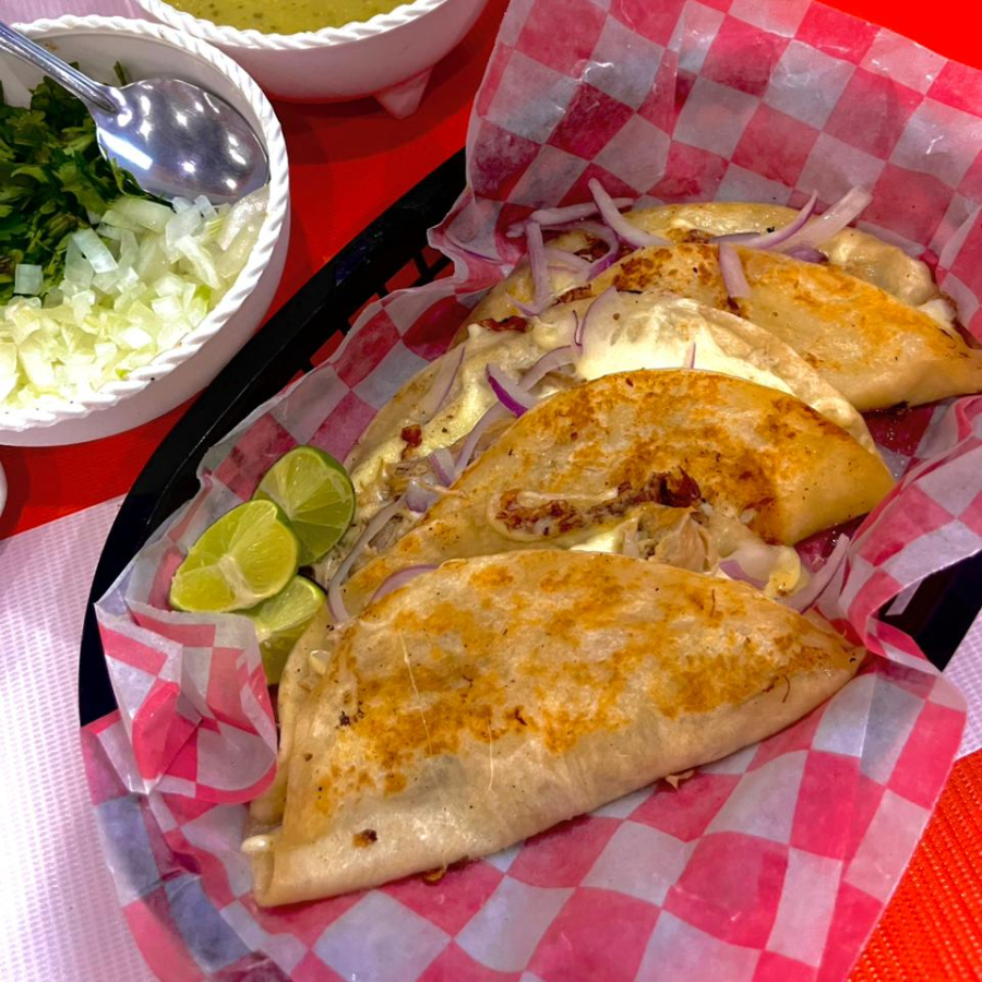 Orden de 3 quesadillas en tortilla de harina con lechon cubano o carde de arrachera de res (a elegir) con queso y acompañado de cebolla morada curtida