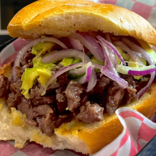 Torta en pan tipo telera, sellado con mantequilla, untado con mayonesa, con carne de arrachera de res con cebolla morada curtida y rebanadas de aguacate acompañado con salsa verde.
