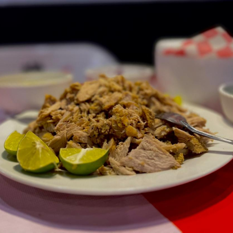 Kilo de carne de lechon cubano, preparacion tipica cubana, incluye verduras, tortillas y salsa.