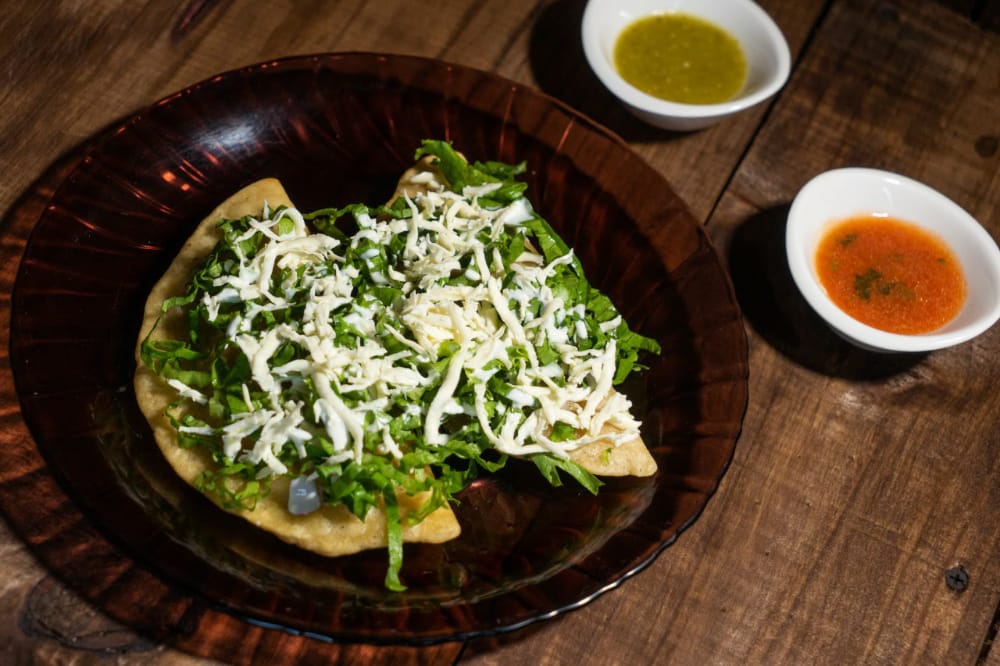 Preparados base de frijol, queso manchego, ingrediente principal, acompañados de pico de gallo y salsa.