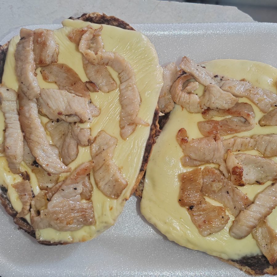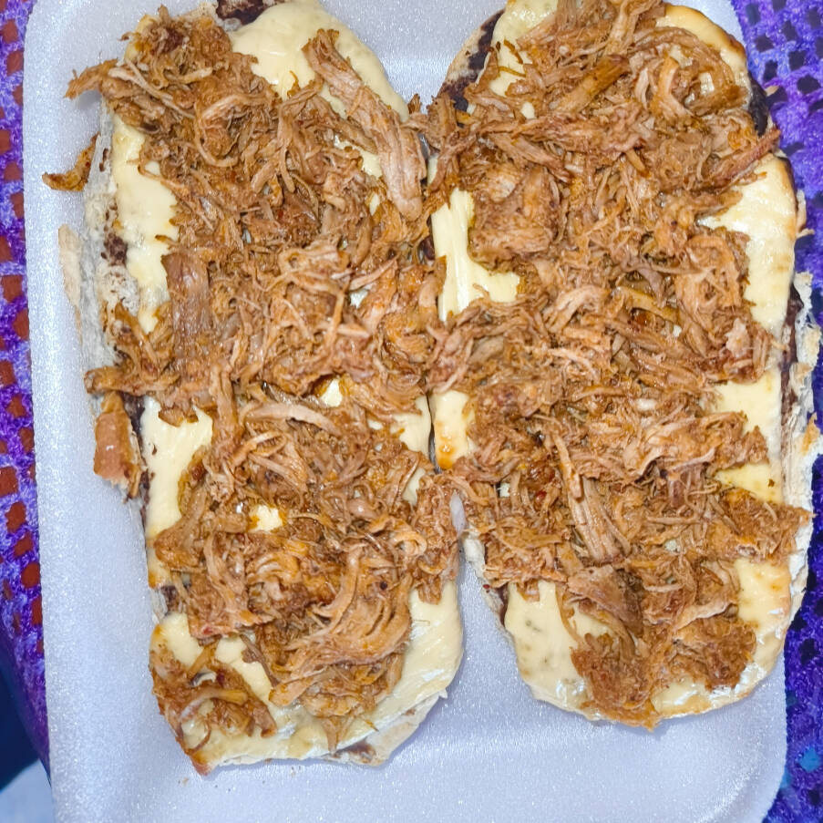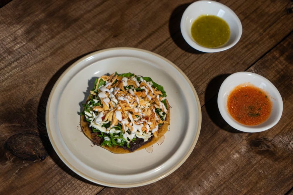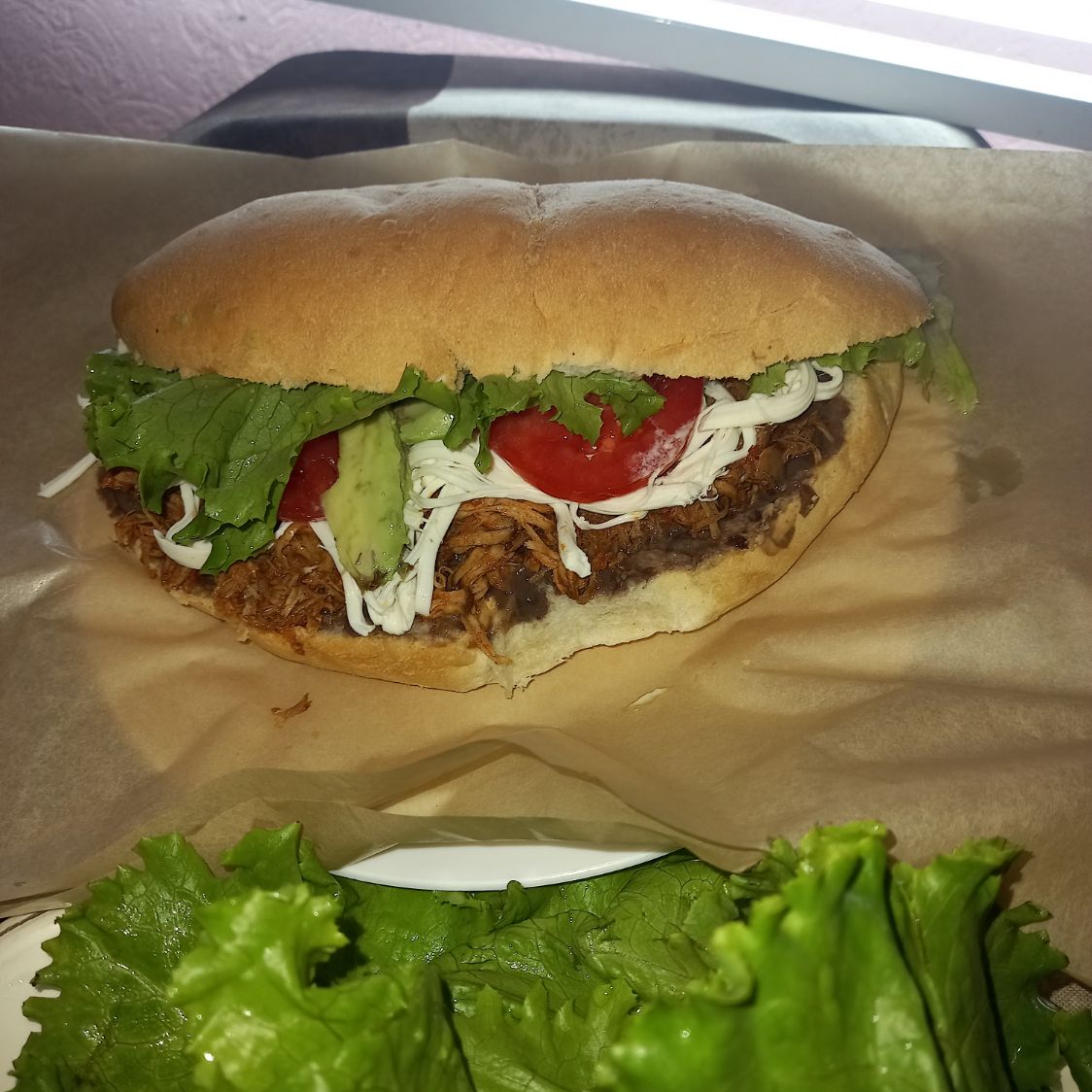 Base de frijol, carne, tomate, lechuga, aguacate, queso de hebra, mayonesa.