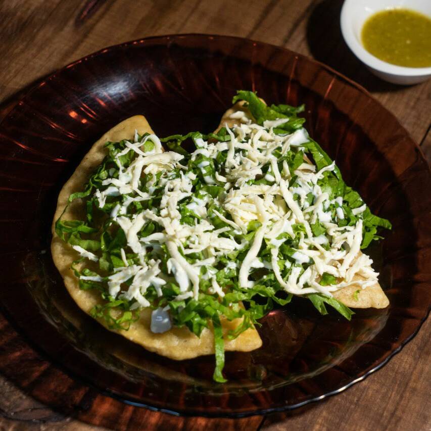 Deliciosa empanadas de picadillo preparadas con lechuga, queso y crema. Acompañadas de salsa.