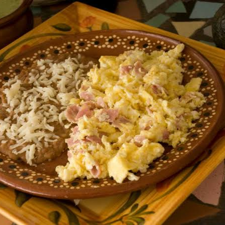 Deliciosa orden de huevos con jamón. Acompañada con frijoles refritos y tortillas hechas a mano.