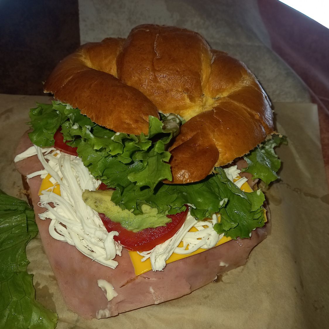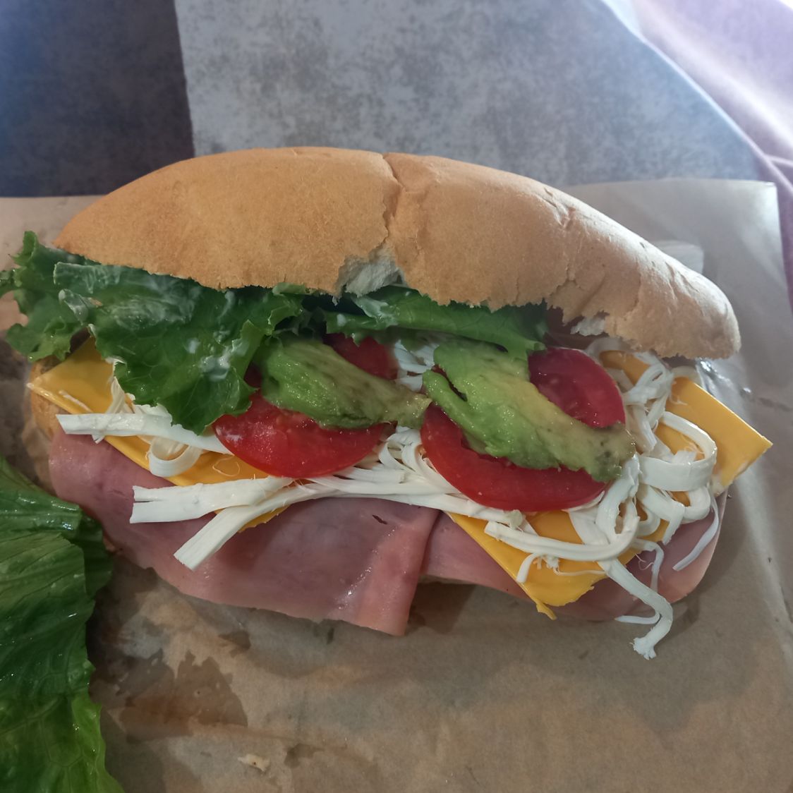 Base de frijol, jamón, queso tipo americano, lechuga, tomate, aguacate, chile jalapeño, mayonesa.