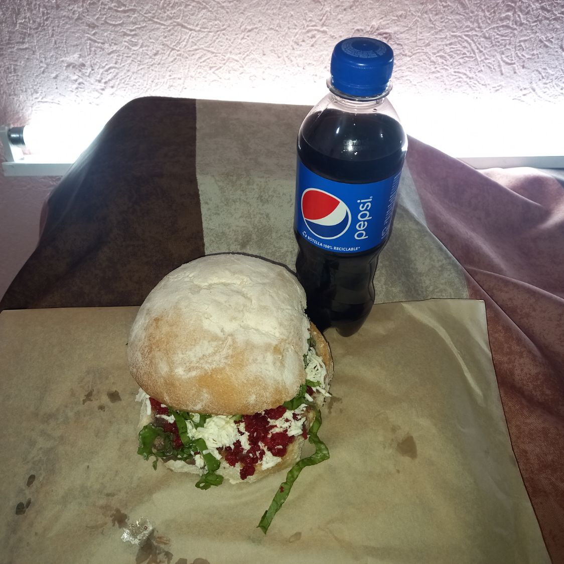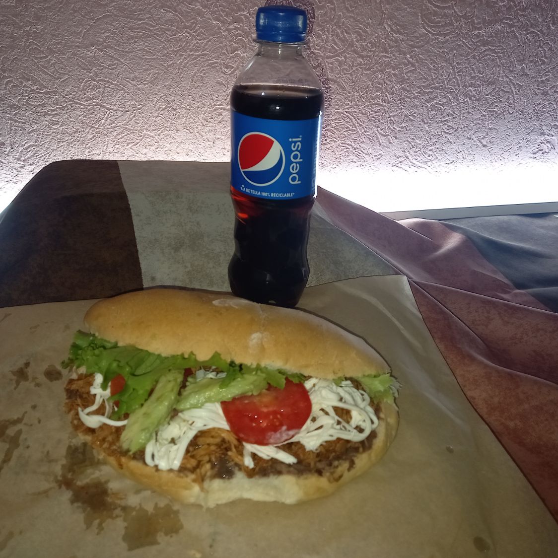 Torta de milanesa acompañada de un refresco de 355 mililitros de la línea Pepsi.